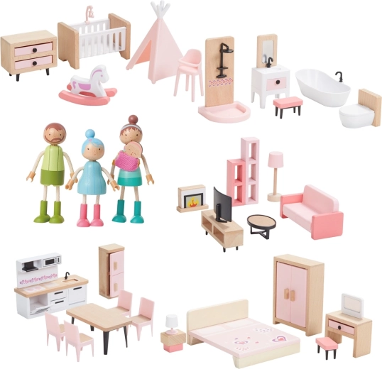 Acest set universal de mobilier pentru căsuță oferă tot ce au nevoie copiii pentru a crea un cămin primitor pentru figurinele lor. Include dotări pentru dormitor, bucătărie, living, baie și camera copiilor într-o combinație armonioasă de lemn natural și accente roz delicate. Nu lipsește nici întreaga familie cu membre flexibile pentru scene autentice și joc de rol.