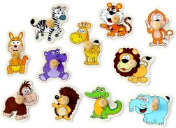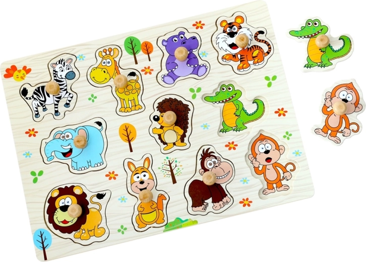 Puzzle-ul din lemn Safari cu piese de inserat aduce copiilor bucuria descoperirii și a învățării. Fiecare dintre cele 11 piese are un mâner practic, datorită căruia se ține bine chiar și cu mânuțele mici. Copiii învață într-un mod distractiv să recunoască forme și animale, își consolidează răbdarea și capacitatea de concentrare.