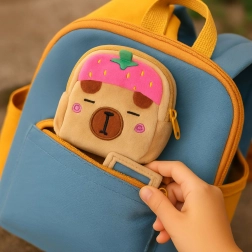 Materialul din pluș și motivul cu capibara și căpșună roz adaugă o notă de kawaii drăgălășenie fiecărei zile – ideal pentru copii și suflete jucăușe.