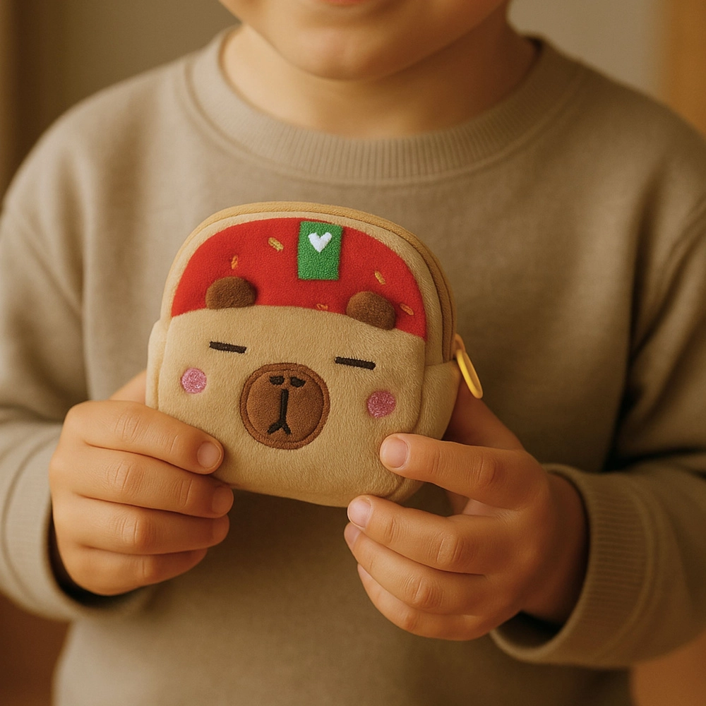 Acest portofel de pluș moale, cu motiv capibara și căciuliță roșie în formă de căpșună, cucerește prin designul drăguț și materialul plăcut. Datorită fermoarului, mărunțișul rămâne în siguranță, iar clipsul îți permite să ai portofelul mereu la îndemână – pe rucsac, geantă sau la bucla pantalonilor.