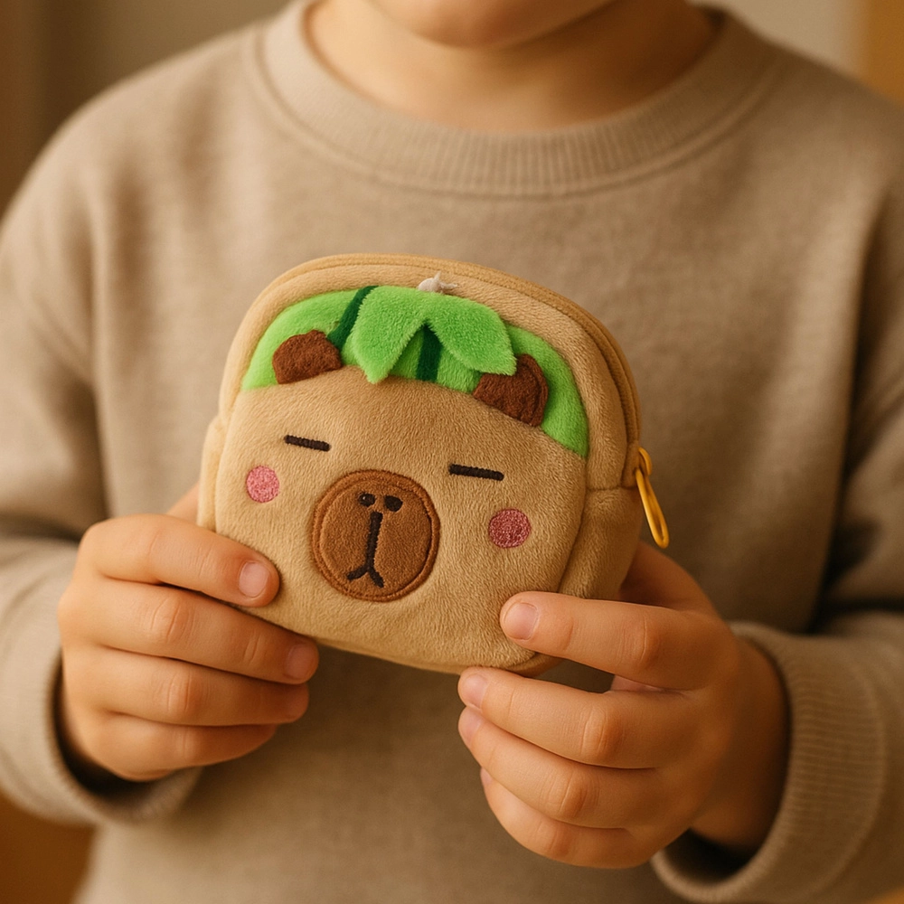 Această portofelă plușată – capibara va încânta copiii și pe iubitorii accesoriilor drăguțe. Materialul moale este plăcut la atingere, fermoarul păstrează monedele, cheile și accesoriile mici în siguranță, iar datorită clipsului practic vei avea portofelul mereu la îndemână.