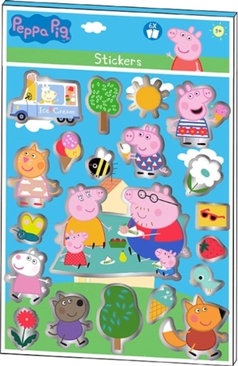 Set vesel de autocolante cu motive Peppa Pig îi va încânta pe toți micii fani. Conține 6 foi pline de autocolante colorate, cu dimensiunea de 23 × 15 cm, ideale pentru decorarea caietelor, jurnalelor, felicitărilor sau pentru activități creative.