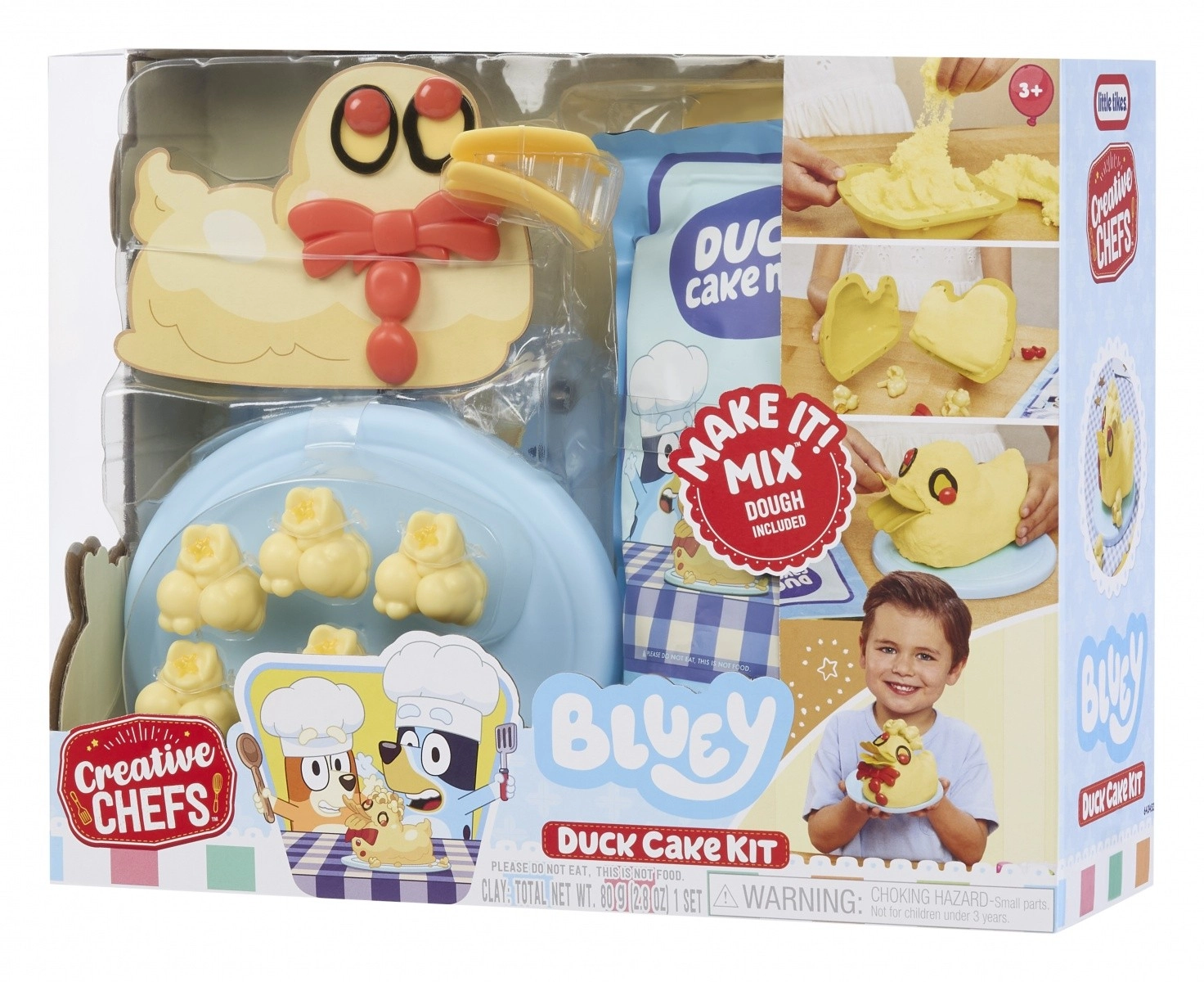Setul CREATIVE CHEFS BLUEY – Tort „Rățușcă” oferă copiilor ore întregi de distracție și le dezvoltă imaginația. Conține 15 accesorii de bucătărie realiste, o formă în shape de rățușcă și pastă modelabilă Make It! Mix. Include și un rețetar ilustrat, care îi învață pe copii să urmeze instrucțiuni simple și susține jocul creativ și role-play-ul.