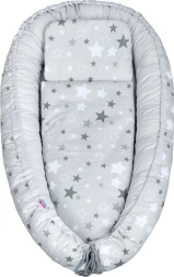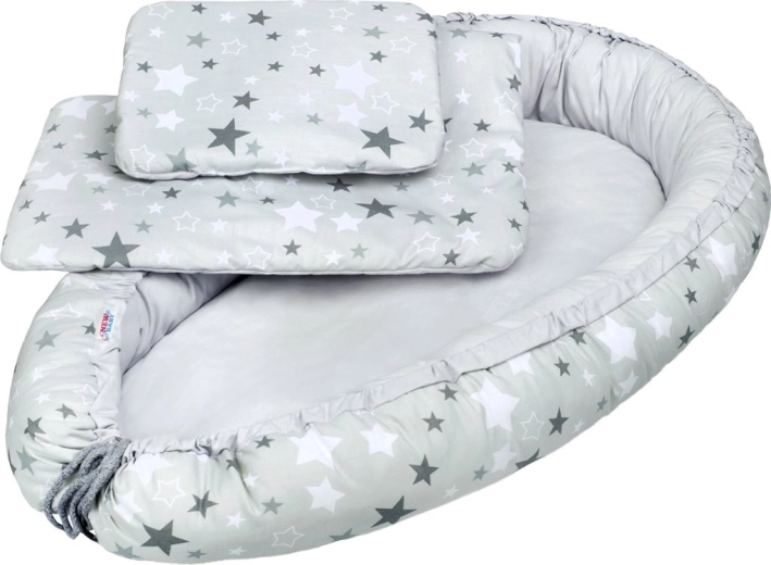 Cuibușorul luxos pentru copii NEW BABY oferă bebelușului o stare de calm și siguranță datorită marginilor moi, înălțate, și suprafeței plăcute din bumbac. Ideal pentru odihnă, somn și schimbare comodă, acasă sau în călătorii. Aspectul elegant alb-gri cu steluțe se potrivește perfect în orice trusou.