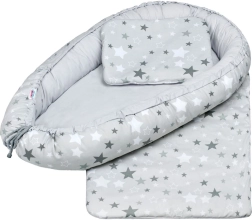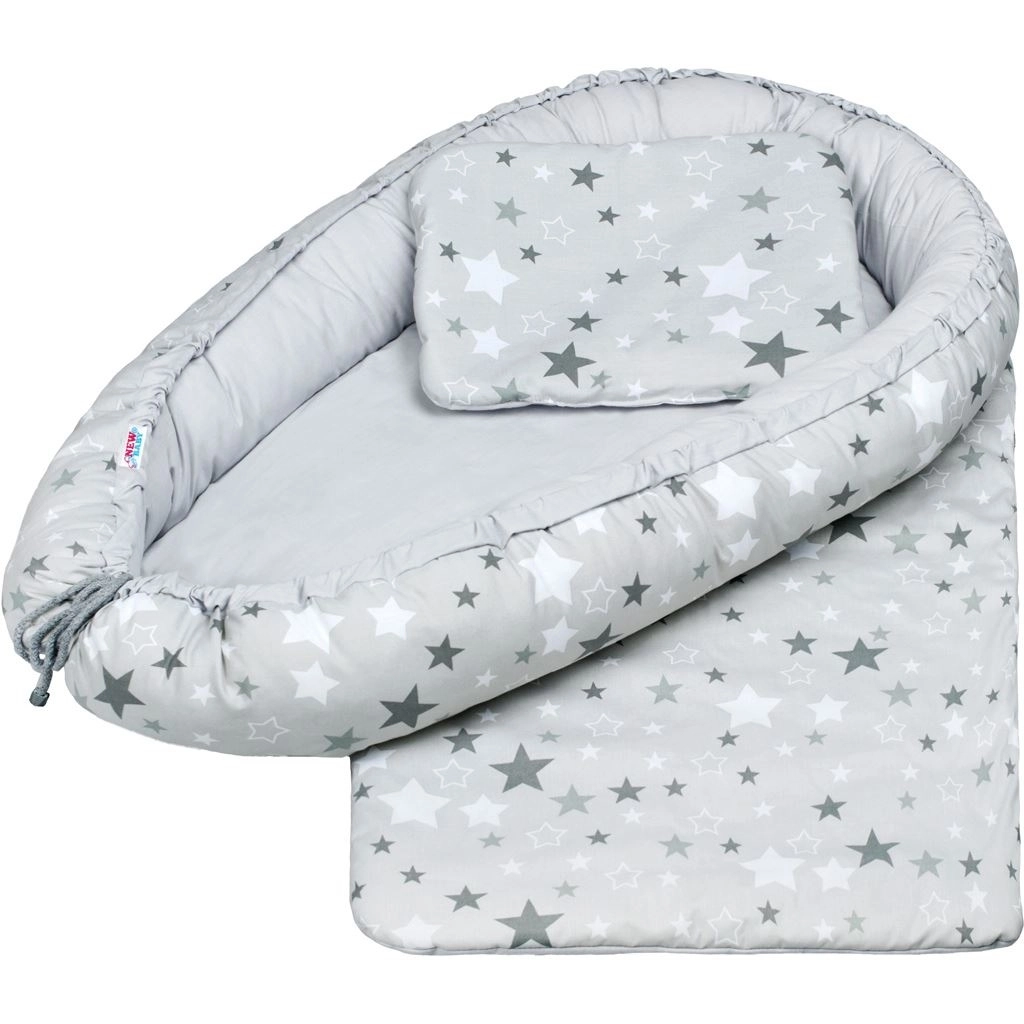 Oferă bebelușului tău un loc sigur și confortabil pentru somn cu cuibușorul luxos NEW BABY, în design alb-gri cu steluțe. Cuibușorul este potrivit de la naștere până la cca 3 luni, realizat din 100% bumbac cu umplutură antialergică pentru confort și siguranță maxime. Setul include o plăpumioară pufoasă și o pernuță, utilizabile și în cărucior sau pătuț.