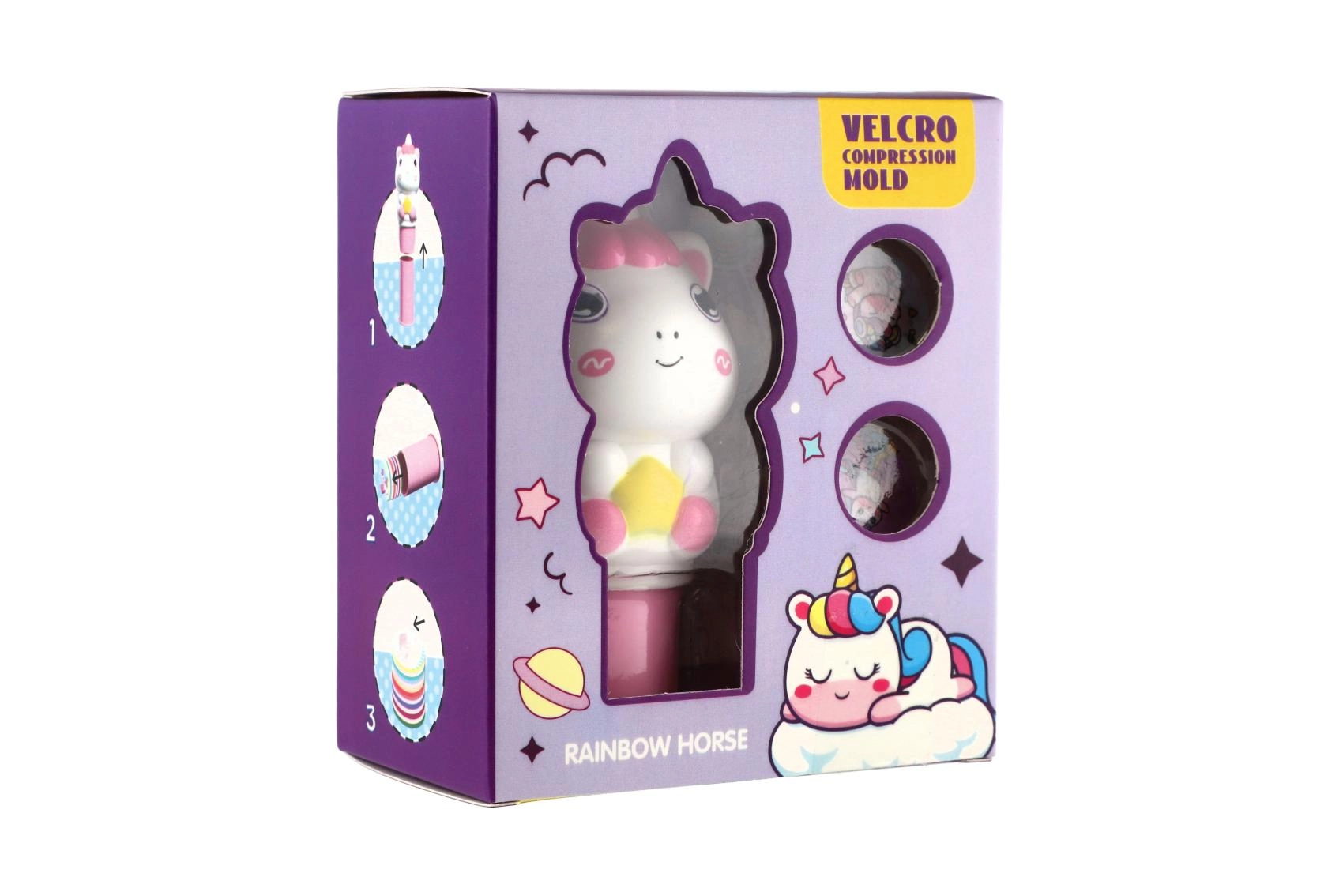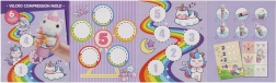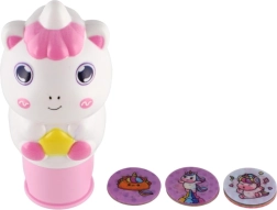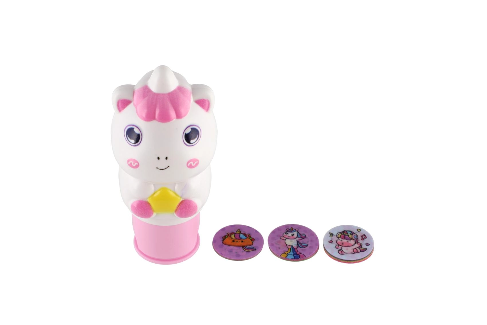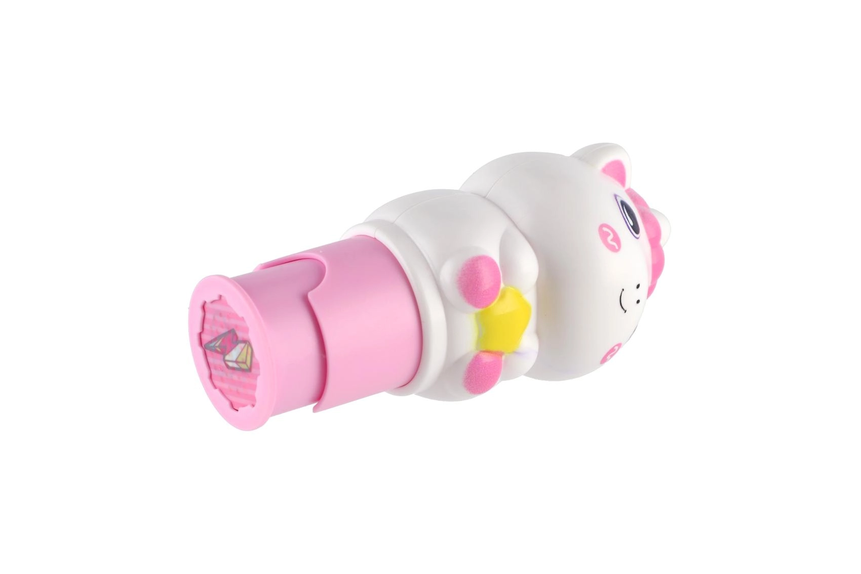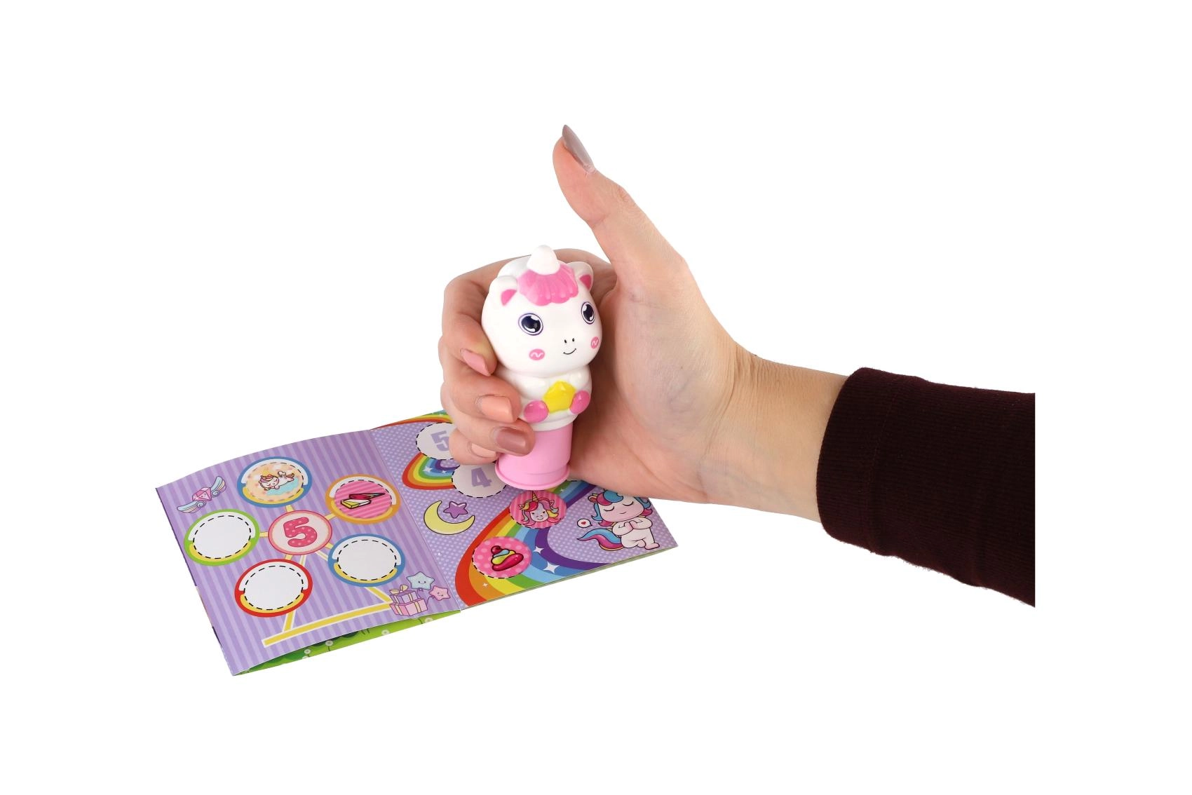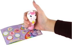 Ştampila este gata de utilizare imediată. Setul de motive cu unicorni şi posibilitatea de a completa proiectele creative cu autocolante fac din această jucărie un cadou perfect pentru micii iubitori de unicorni.