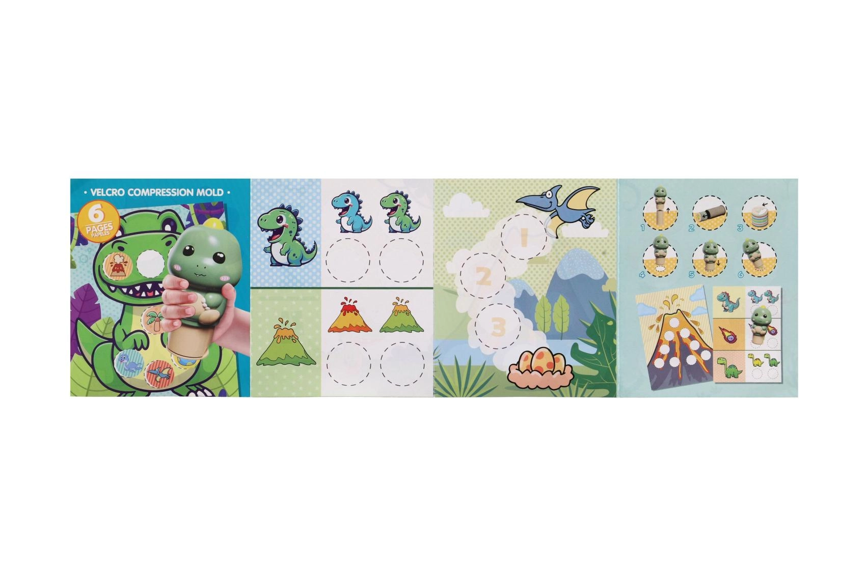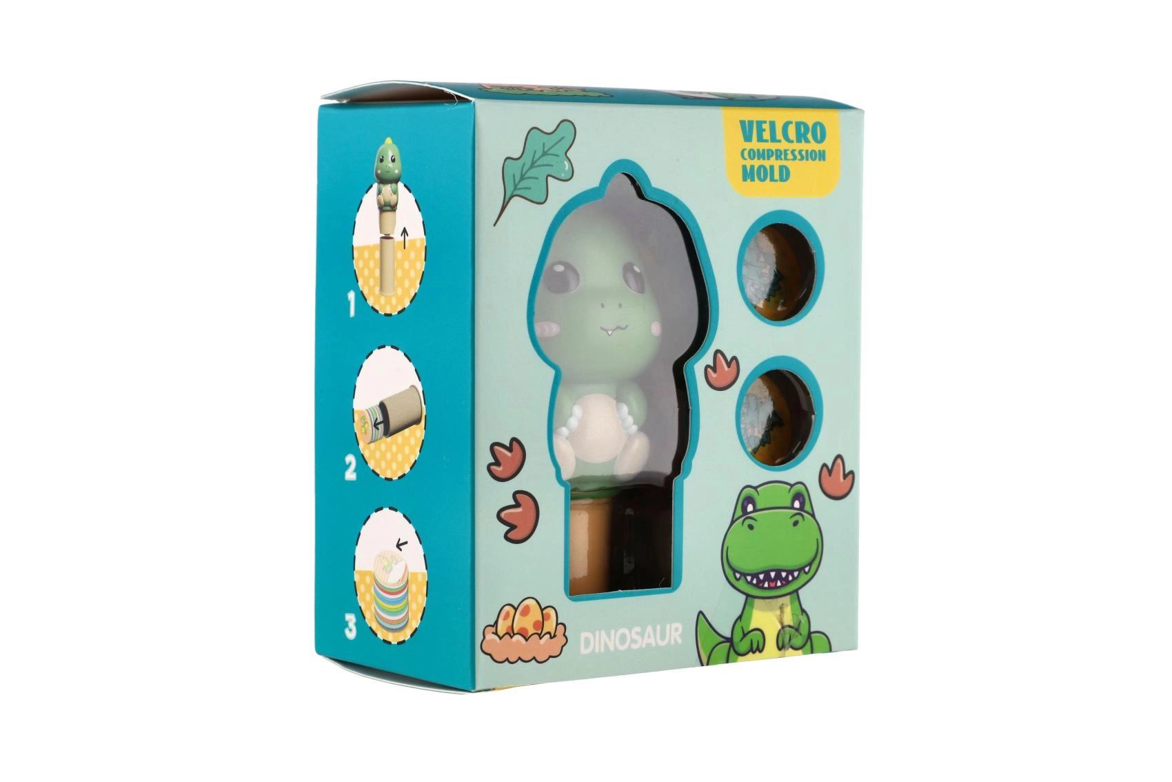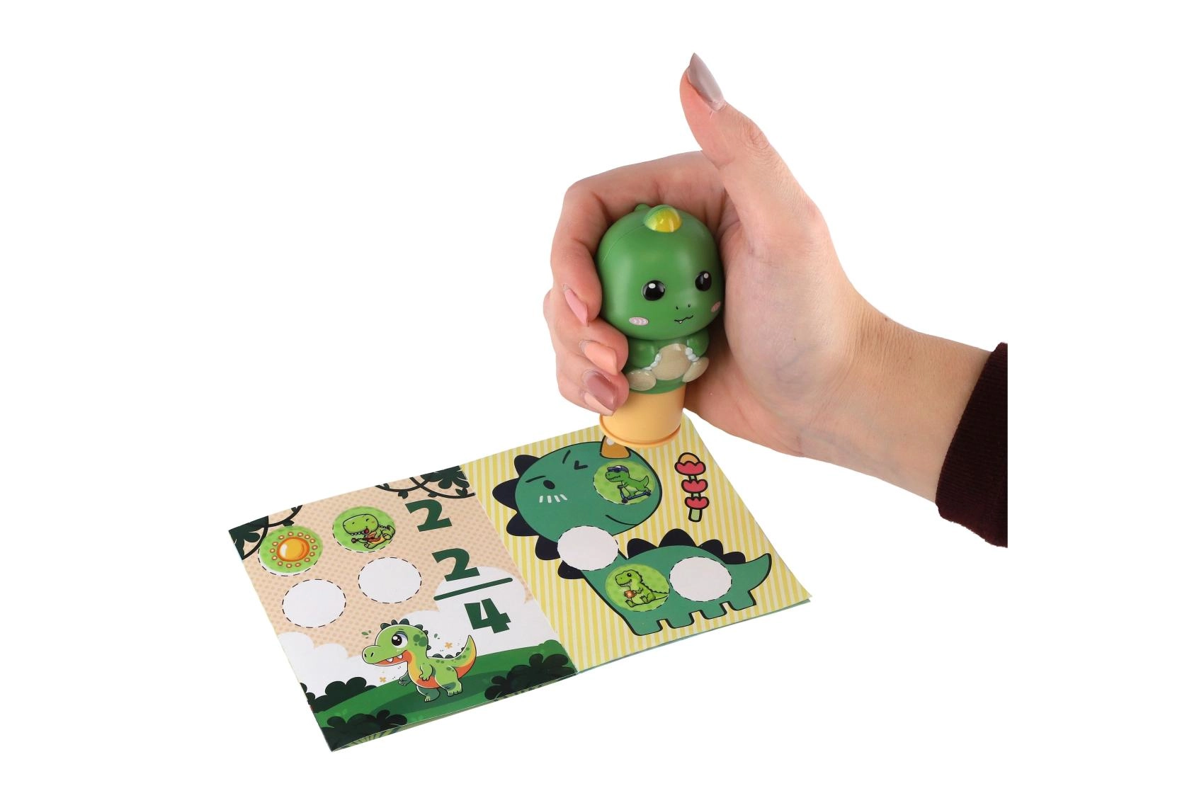 Acest set creativ cu ștampilă cu dinozaur sprijină imaginația copiilor și motricitatea fină. Forma ergonomică este adaptată mânuțelor mici, astfel încât ștampilarea este confortabilă. Sunt incluse discuri autocolante colorate cu motive de dinozauri și o coală tematică pe care copiii își pot lipi creațiile.