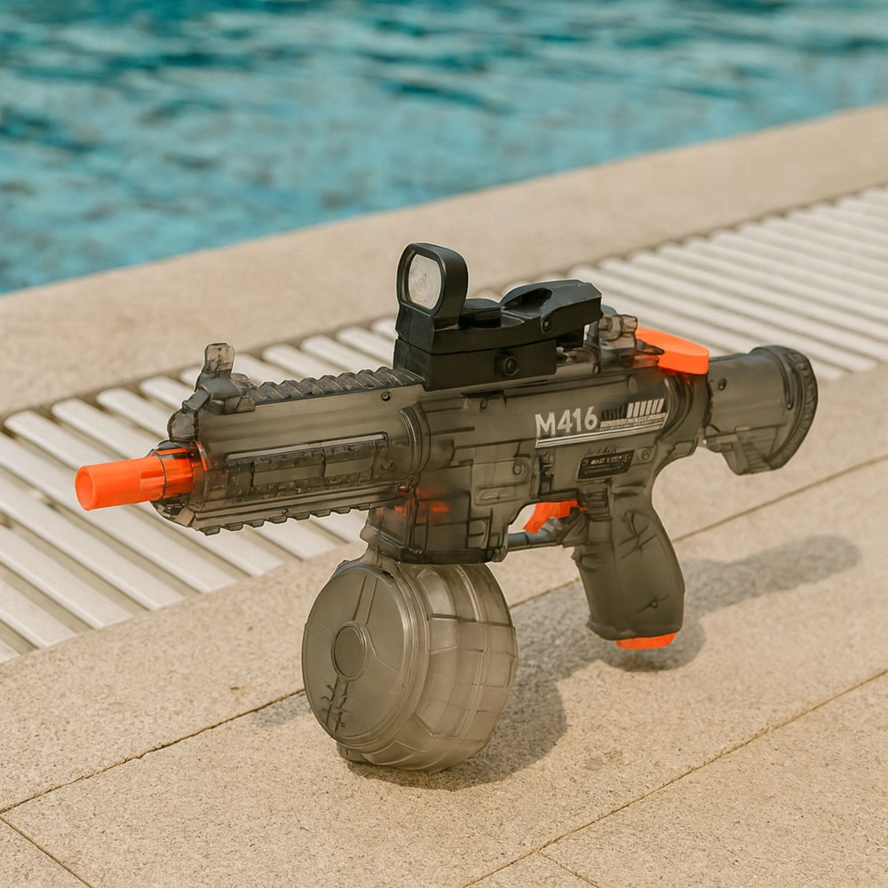Pistolul cu apă electric M416 este ideal pentru bătălii în aer liber la piscină, în grădină sau pe plajă. Mânerul ergonomic, acționarea automată și rezervorul mare tip tambur oferă performanță stabilă fără pompare continuă. Corpul transparent cu elemente de siguranță portocalii arată modern, iar LED-ul de la gura țevii adaugă dinamism acțiunii.