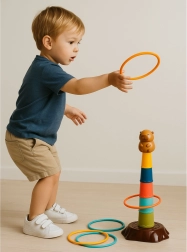 Acest joc de aruncat cu inele pentru copii aduce un motiv vesel cu capibara și o asamblare ușoară a turnului din cinci etaje. Scopul este să arunci inelele astfel încât să ajungă pe turn – copiii își antrenează natural precizia, concentrarea și coordonarea ochi–mână. Piesele din plastic ușoare și sigure sunt plăcute la ținut în mână și potrivite și pentru copiii mai mici.
