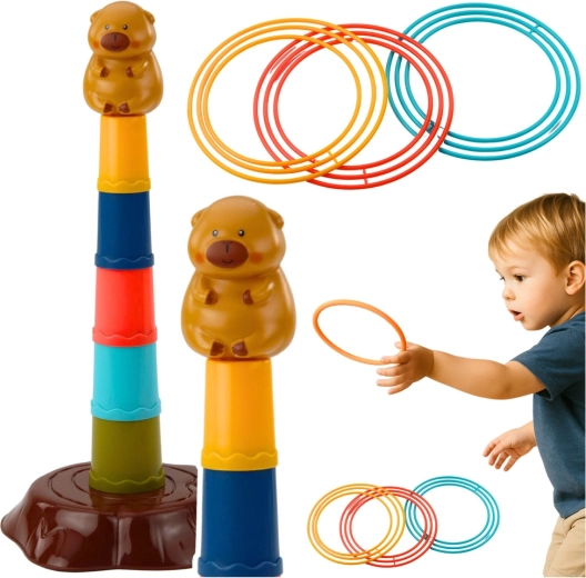 Jocul distractiv de aruncat cu tematică de capibara dezvoltă motricitatea fină, coordonarea și precizia. Turnul stabil și colorat, cu 5 niveluri și o figurină drăgălașă de capibara în vârf, este ideal pentru copii atât acasă, cât și în aer liber. Plasticul ușor și sigur și inelele colorate în trei mărimi asigură multă distracție activă pentru toată familia.