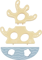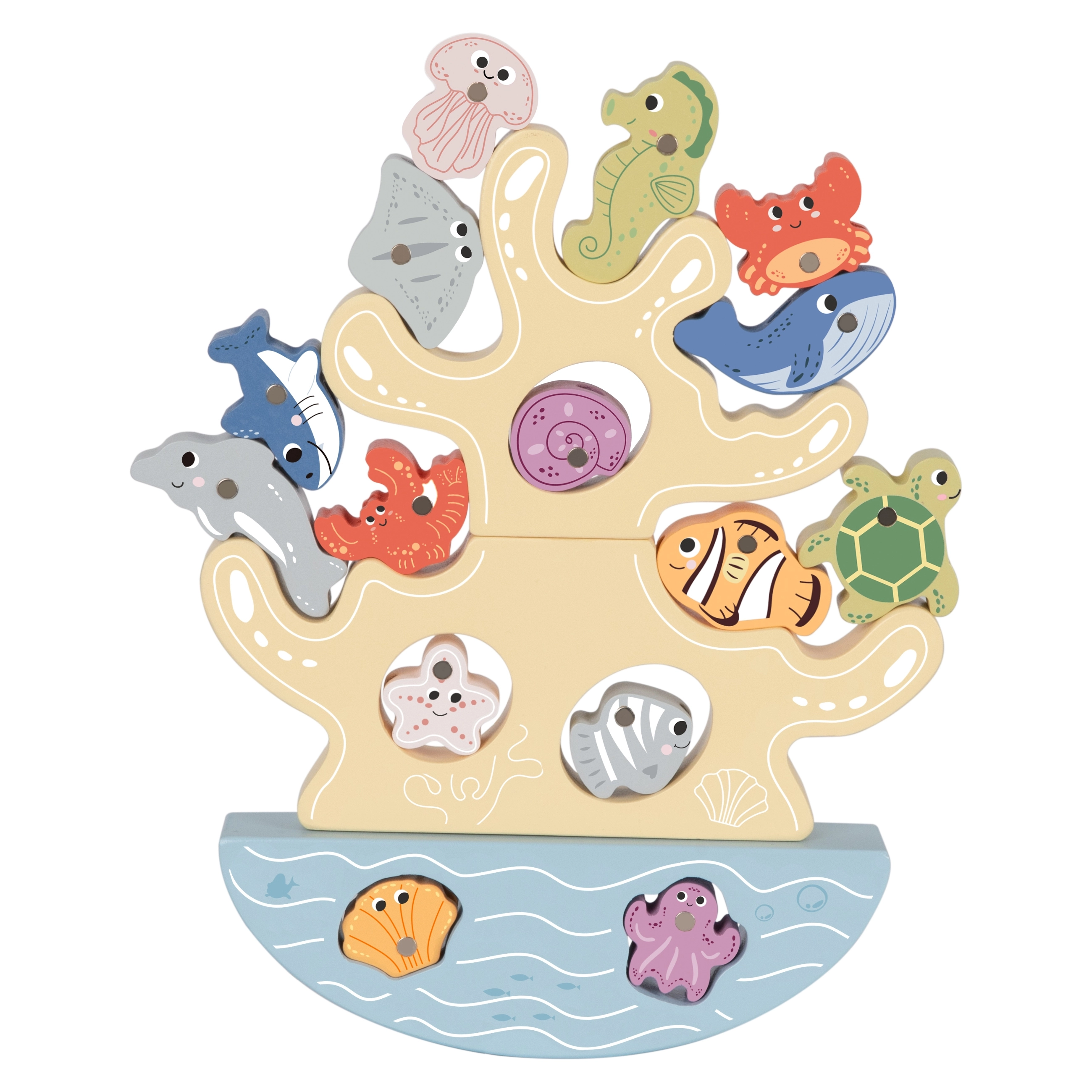Turnul de corali pe o bază legănată invită la așezare și echilibrare. Dezvoltă motricitatea fină, logica și percepția spațială într-un mod ludic.