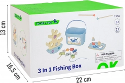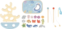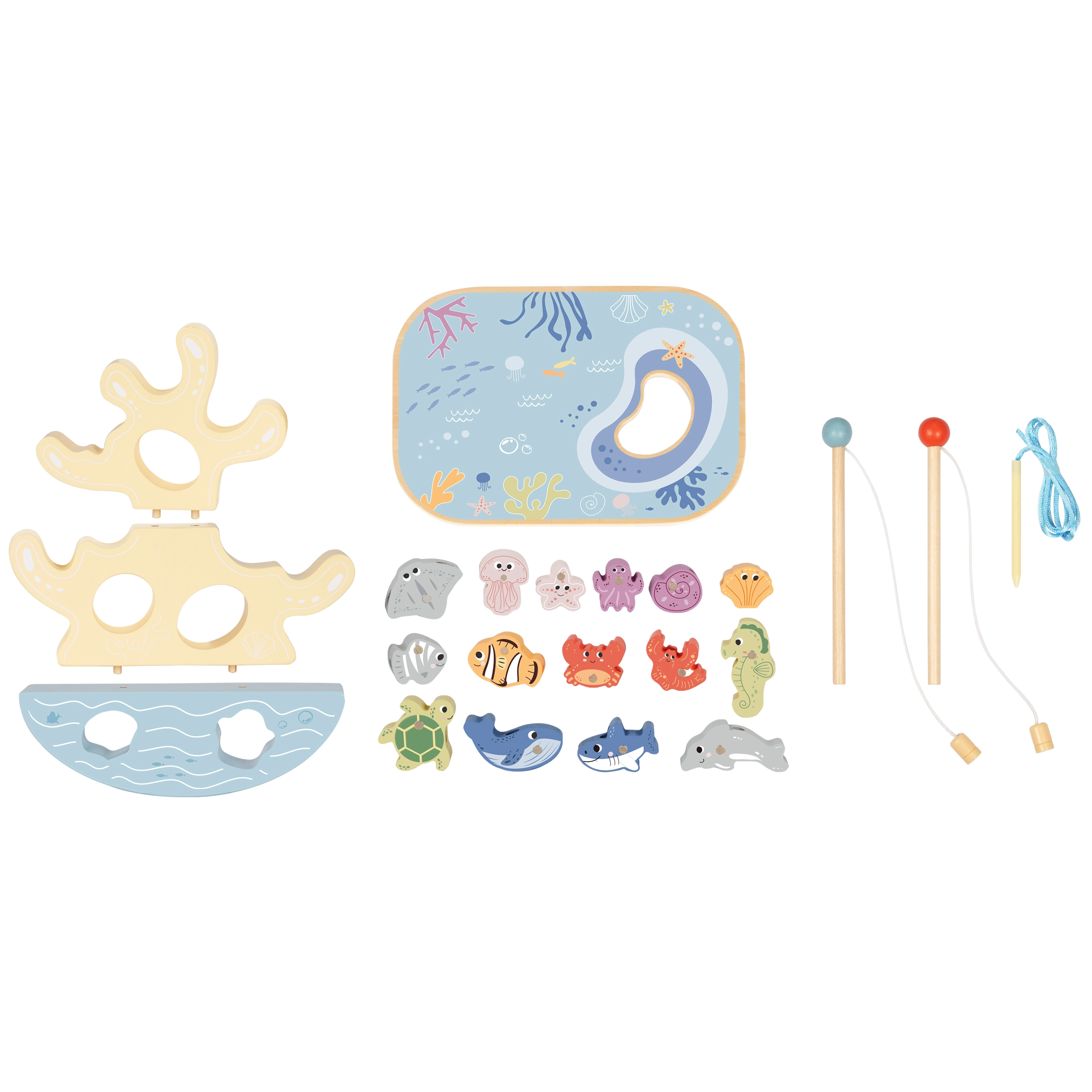 Două undițe din lemn cu magneți și animăluțe colorate transformă masa într-un ocean. Copiii își antrenează precizia, răbdarea și coordonarea mână–ochi în timp ce pescuiesc după forme și culori.