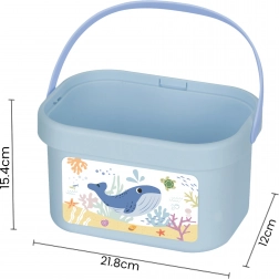 Totul se depozitează într-o găleată rezistentă cu mâner, al cărei capac servește drept planșă de joc. Setul susține coordonarea mână–ochi, recunoașterea culorilor și formelor și jocul creativ. O alegere excelentă pentru distracție cu sens acasă și în călătorii.