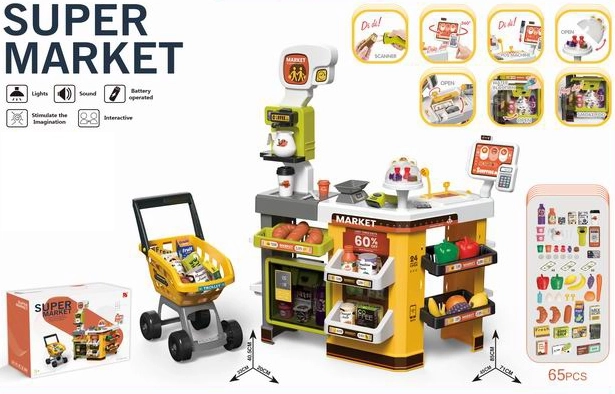 Descoperă distractivul supermarket pentru copii cu 65 de accesorii, care transformă orice cameră într-un magazin adevărat. Include coș de cumpărături, frigider pe baterii, terminal de plată și scanner pentru un joc realist. Ideal pentru dezvoltarea creativității, comunicării și a motricității fine.