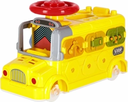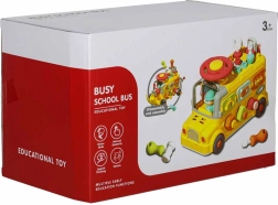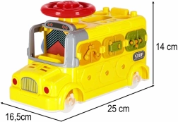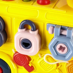 Autobuzul interactiv combină vehiculul și mini‑atelierul într‑unul singur. Copiii pot conduce, înșuruba, încerca încuietori cu chei, roti volanul și explora „motorul” sub capota rabatabilă. Sarcinile variate dezvoltă natural motricitatea fină, răbdarea și rezolvarea problemelor.