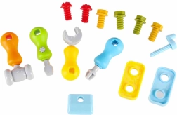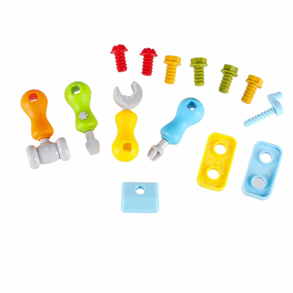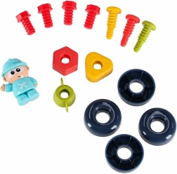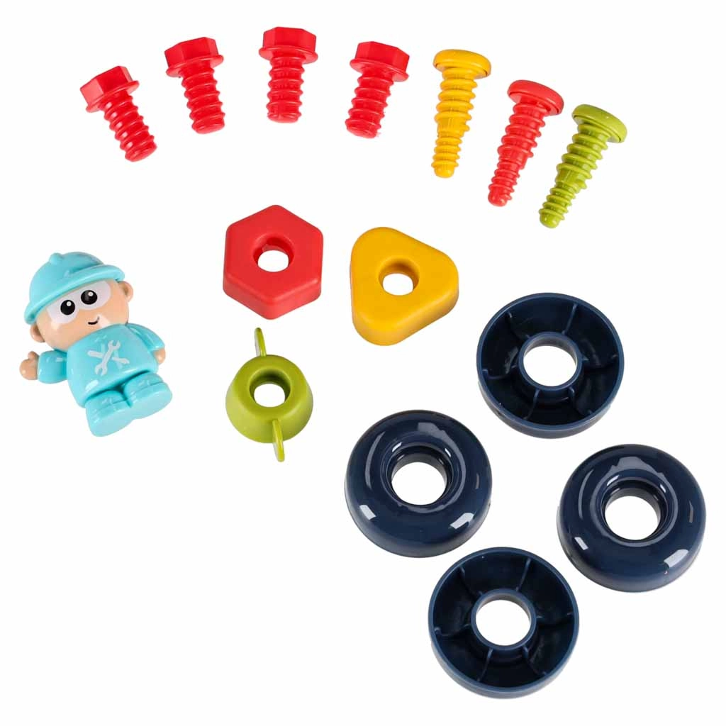 Setul include șuruburi, piulițe, roți dințate, șurubelnițe, cheie și ciocănel. Copiii exersează precizia și coordonarea în timp ce fixează piesele și antrenează recunoașterea formelor.