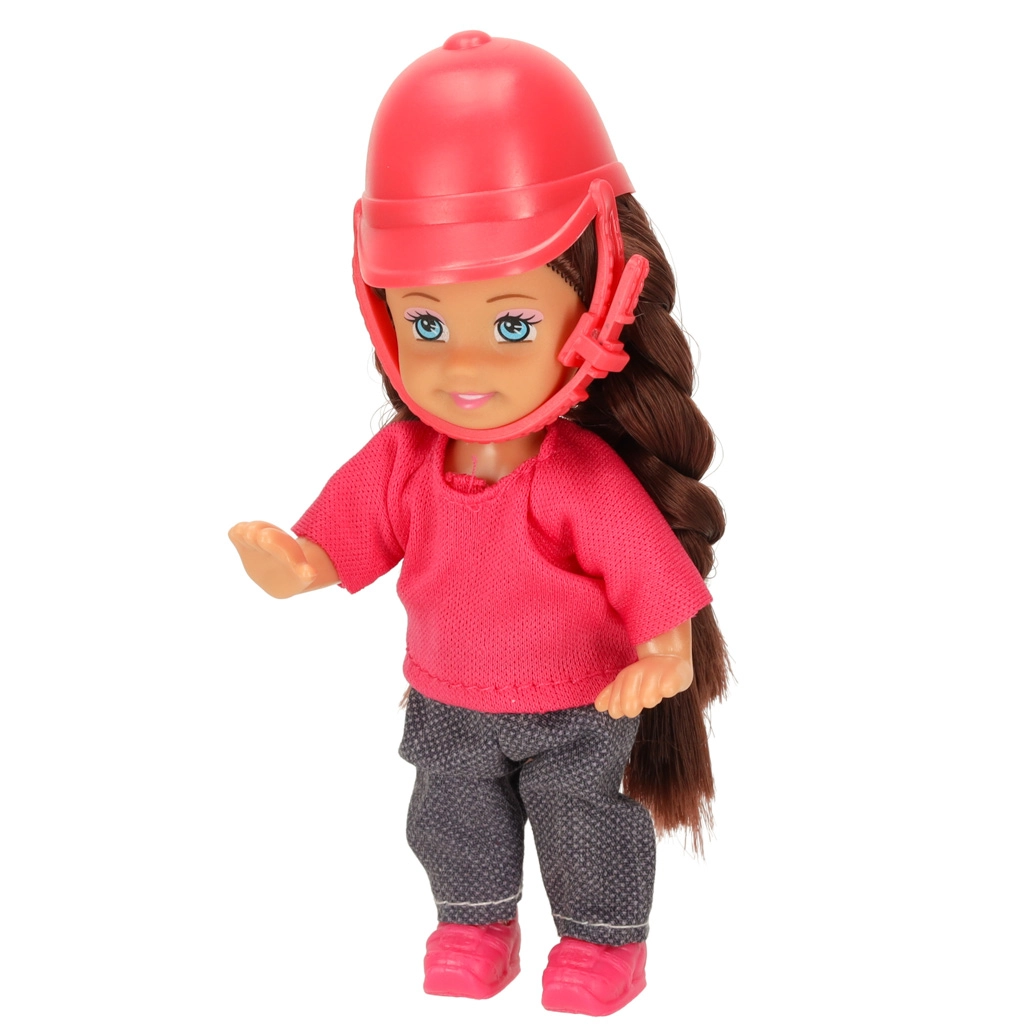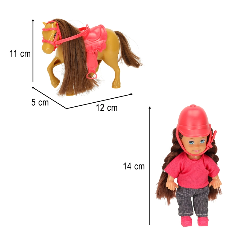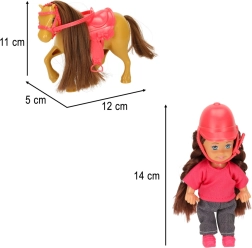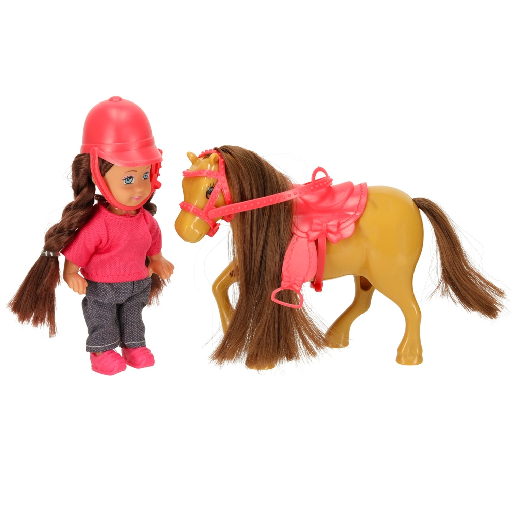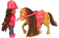 Setul este asortat într-o combinație de culori maro–roz și conține 5 piese, inclusiv accesorii detașabile. Păpușa are brațe și picioare flexibile, astfel încât stă ușor în șa, iar ambele figurine au păr lung potrivit pentru pieptănat.