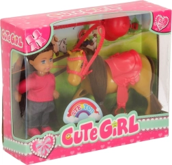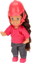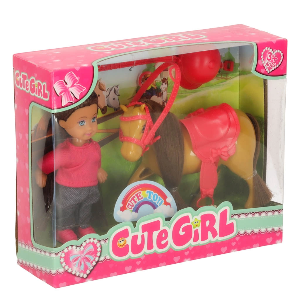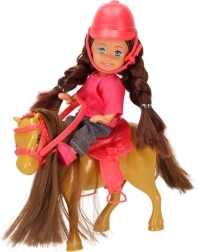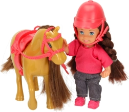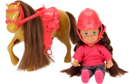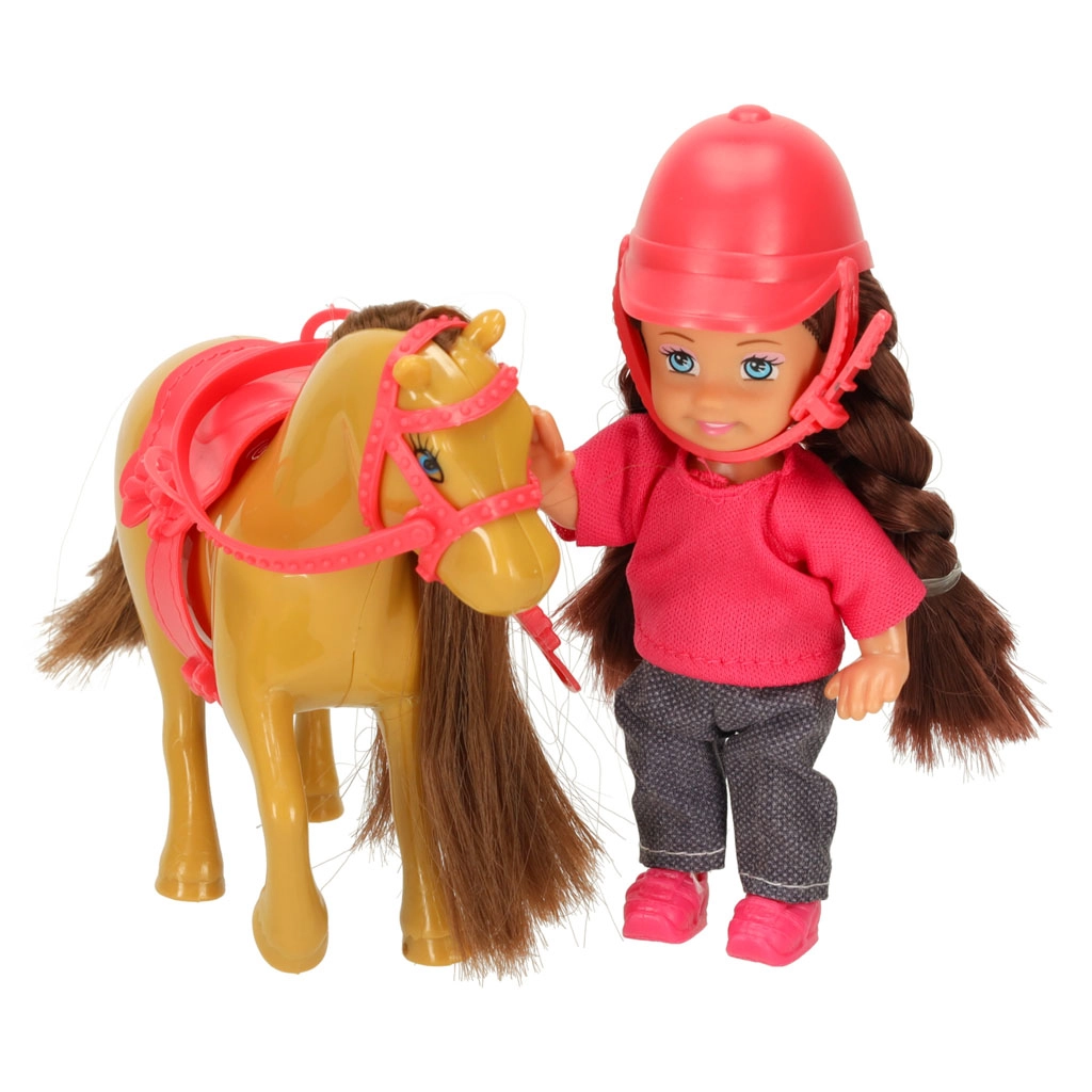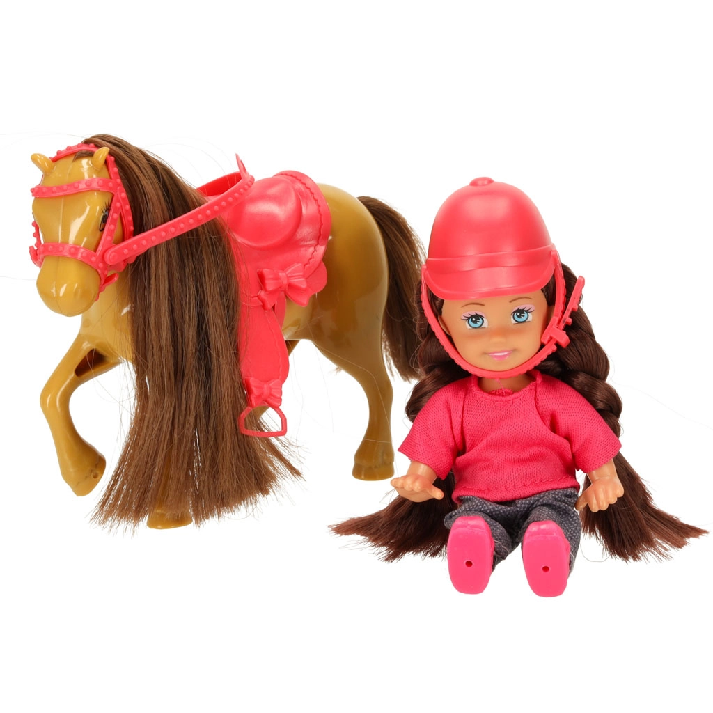 Setul este asortat într-o combinație de culori maro–roz și conține 5 piese, inclusiv accesorii detașabile. Păpușa are brațe și picioare flexibile, astfel încât stă ușor în șa, iar ambele figurine au păr lung potrivit pentru pieptănat.