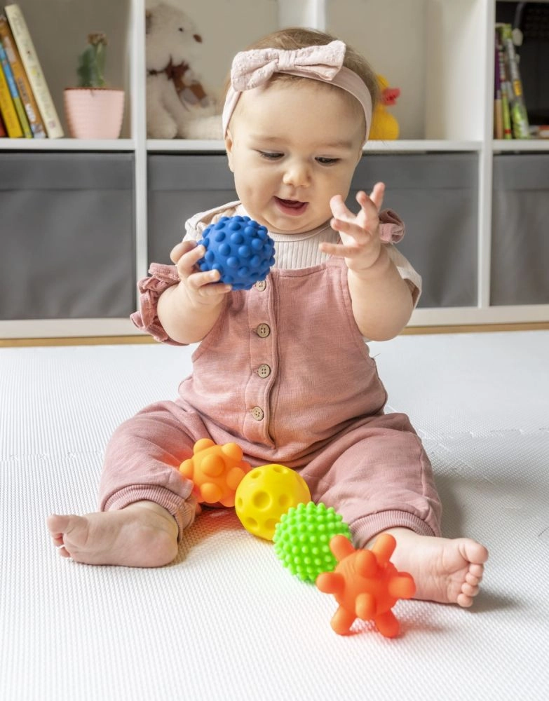 Fiecare minge are o suprafață diferită, cu proeminențe sau adâncituri care stimulează atingerea, sprijină prinderea și dezvoltarea motricității fine.