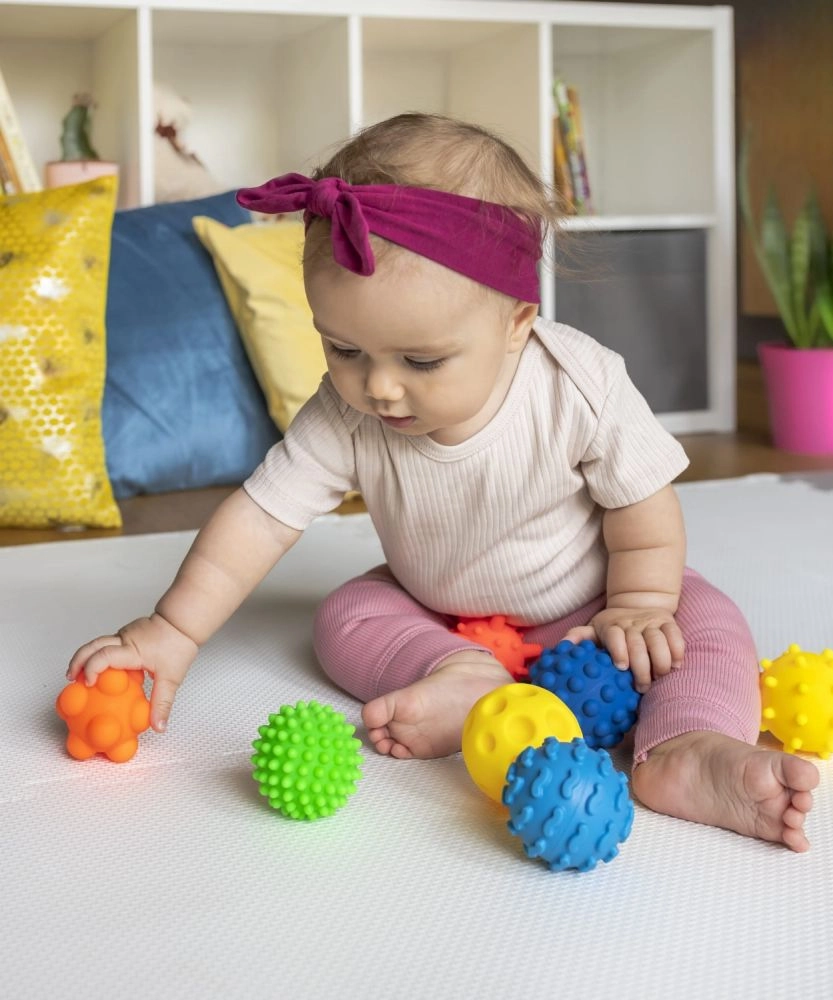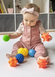 Fiecare minge oferă o altă suprafață – țepișori, denivelări și șanțuri pentru stimulare tactilă intensă și bucuria descoperirii.
