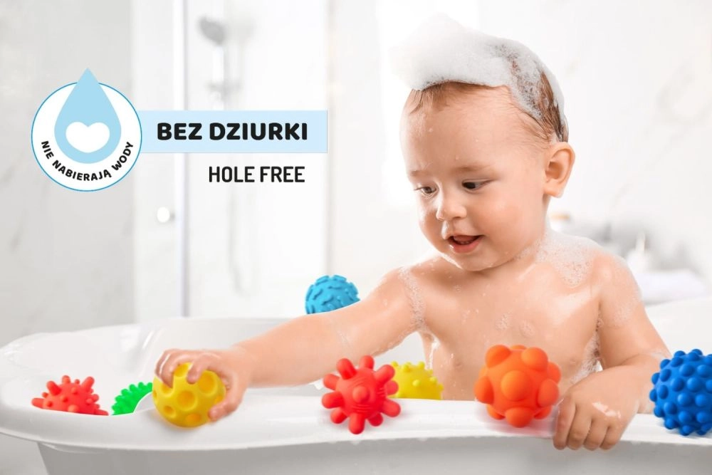 Construcția fără orificii împiedică reținerea apei și a murdăriei – mingile se spală ușor și sunt ideale și pentru baie.