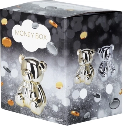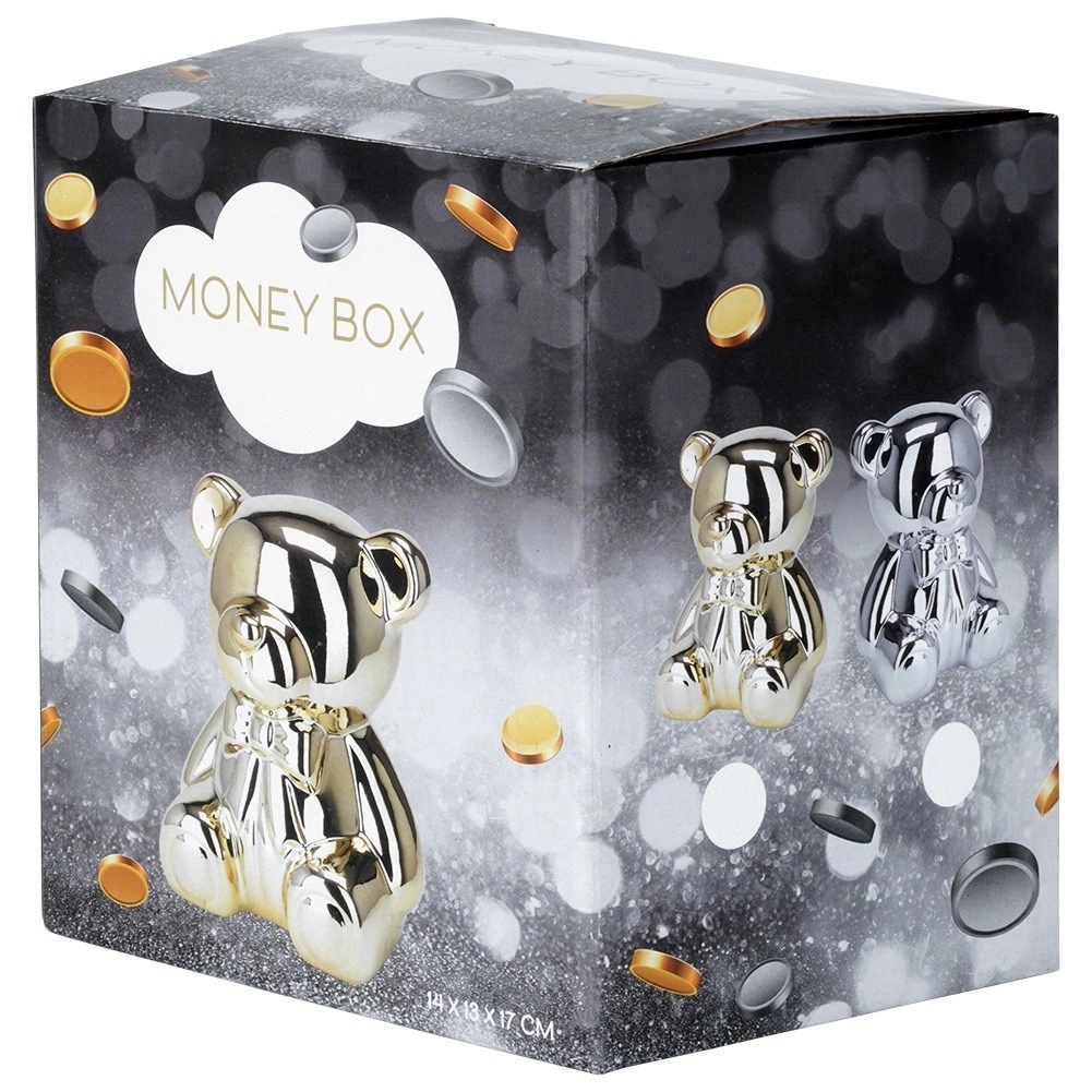 Eleganta pușculiță în formă de urs, cu suprafață argintie lucioasă, tip oglindă, reflectă frumos lumina și servește ca decorațiune stilată și loc practic pentru economii. Datorită deschiderii în partea de jos, scoți ușor monedele fără a o sparge. Ideală ca cadou pentru copii și adulți.