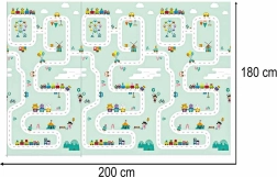 Pandale drăgălașe pe o parte și motiv cu drumuri pe cealaltă stimulează imaginația, învățarea și distracția cu mașinuțe și seturi de construcție.