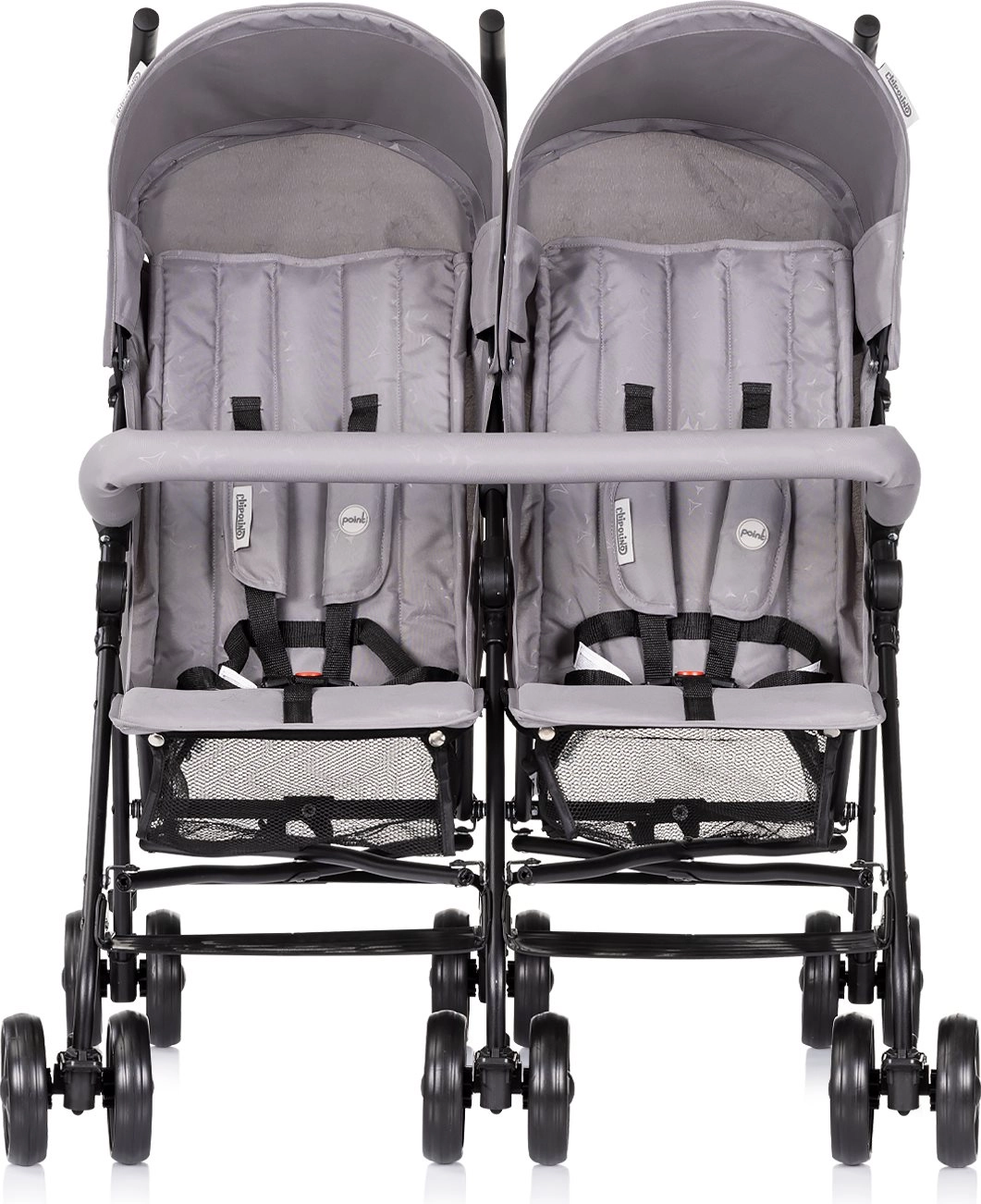 Căruciorul pentru gemeni CHIPOLINO Double Point combină un cadru clasic ușor cu dotări gândite pentru confortul copiilor și al părinților. Datorită scaunelor amplasate unul lângă altul, ambii micuți au suficient spațiu, iar centurile în 5 puncte cu pernuțe moi și bara frontală de siguranță comună le oferă protecția necesară. Capotinele rabatabile protejează de soare și vânt, iar coșul de depozitare mare găzduiește tot ce este necesar în drum.