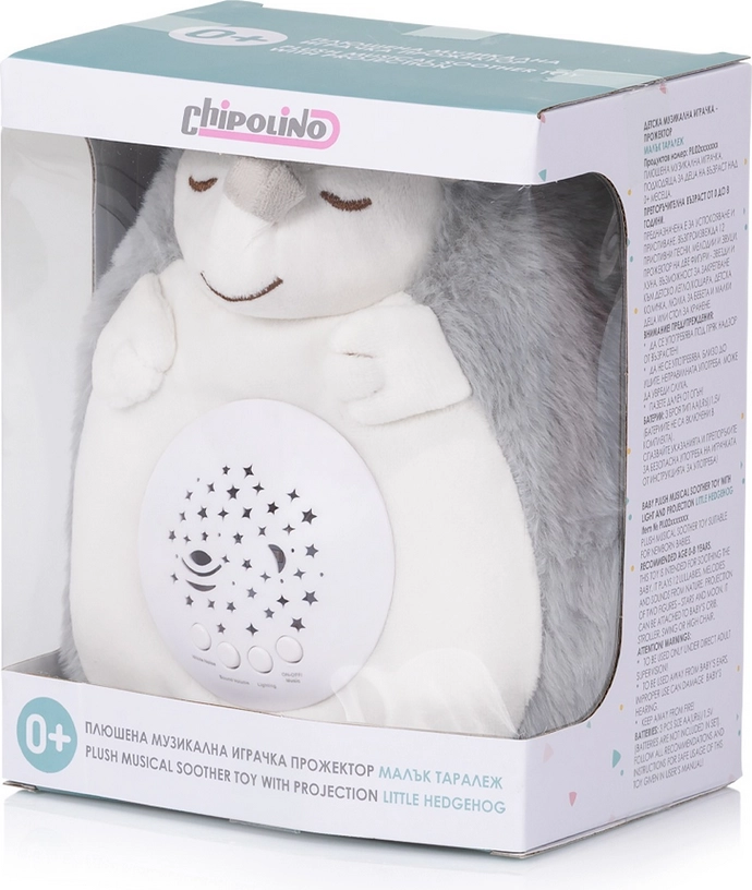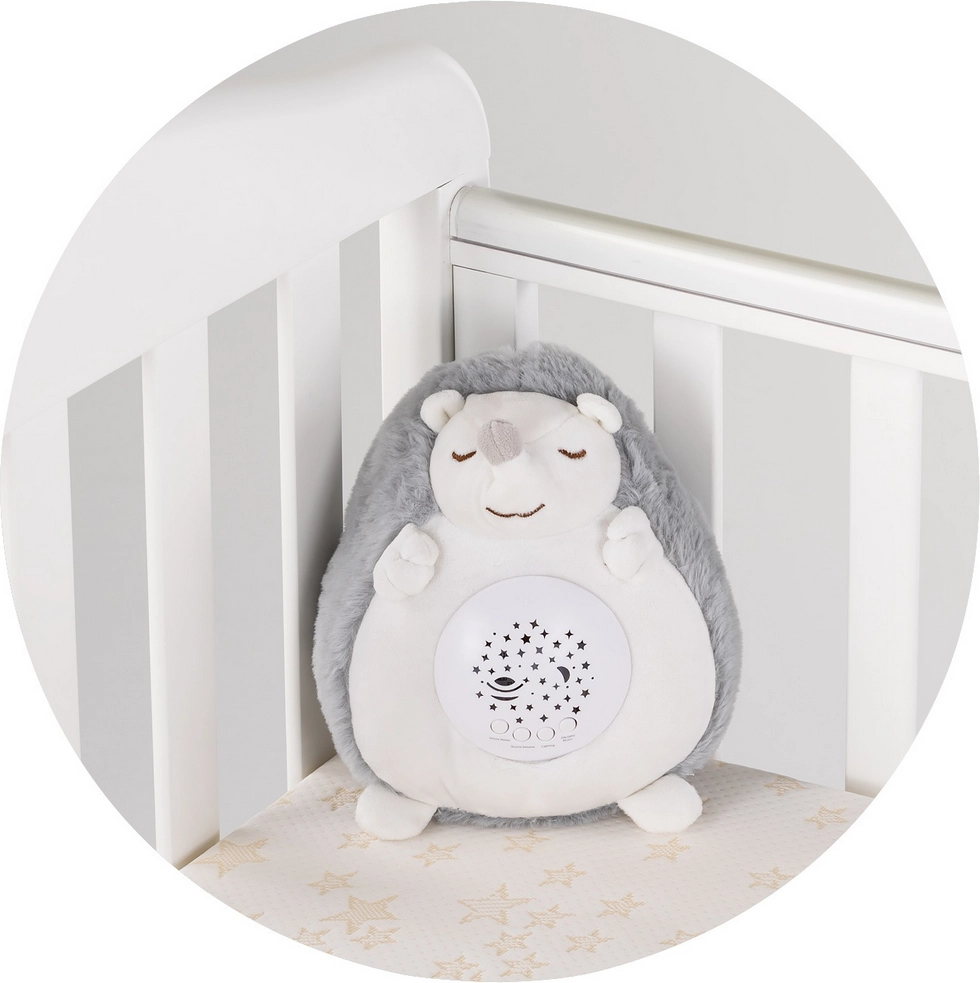 Ariciul de pluș prietenos creează o atmosferă calmă înainte de culcare datorită proiectorului LED color cu combinații de roșu, verde și albastru, care se succed delicat și proiectează steluțe în încăpere. Alege dintre 10 cântece de leagăn sau 5 tipuri de zgomot alb (de ex. bătăi de inimă, foșnet) și adaptează ritualul de seară la starea copilului.