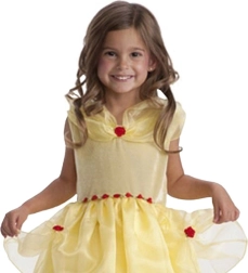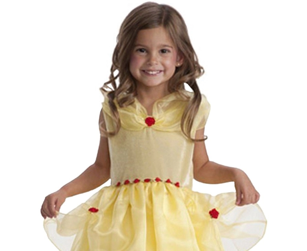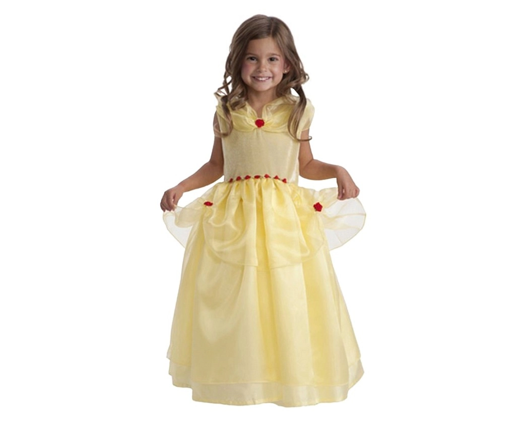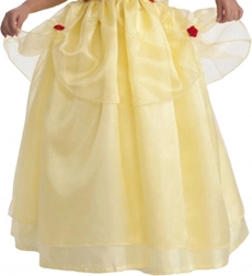 Fusta bogată, galbenă, cu mai multe straturi și trandafirași decorativi roșii creează un aspect încântător inspirat de Belle.