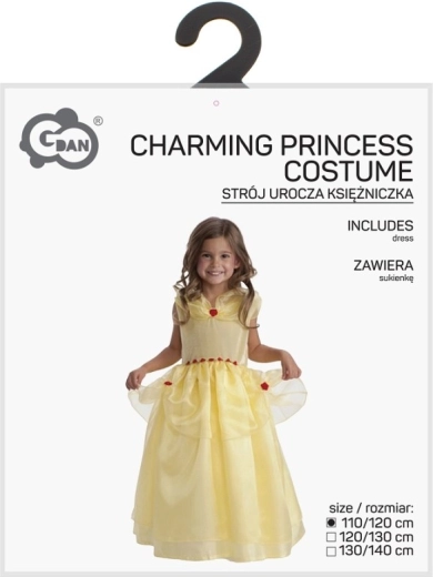Acest costum încântător, inspirat de îndrăgita eroină de basm, transformă orice fetiță într-o adevărată prințesă. Rochia, în nuanță bogată de galben, are o fustă multistrat pentru un volum frumos, suprapuneri din șifon și aplicații florale, care oferă un aspect festiv.