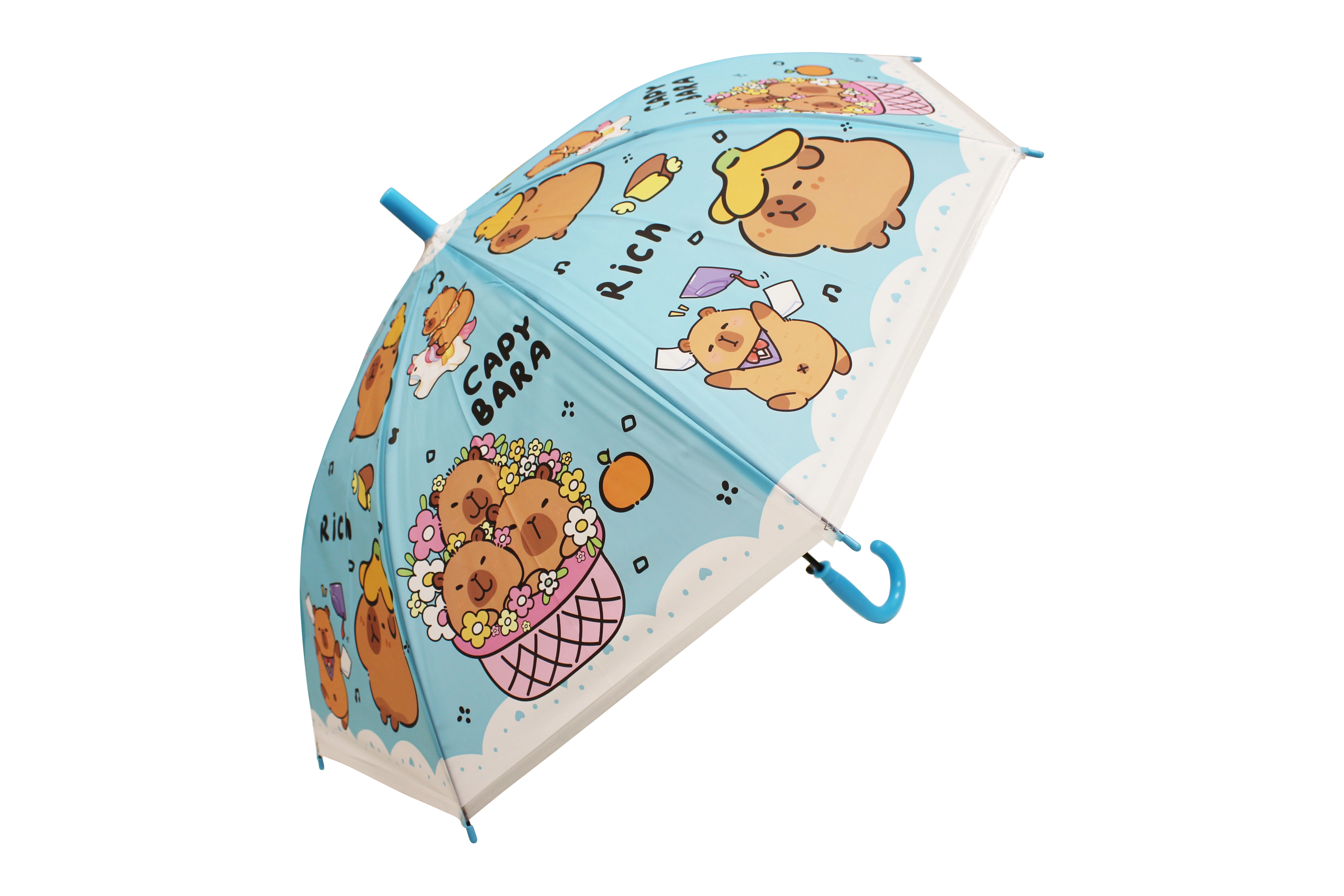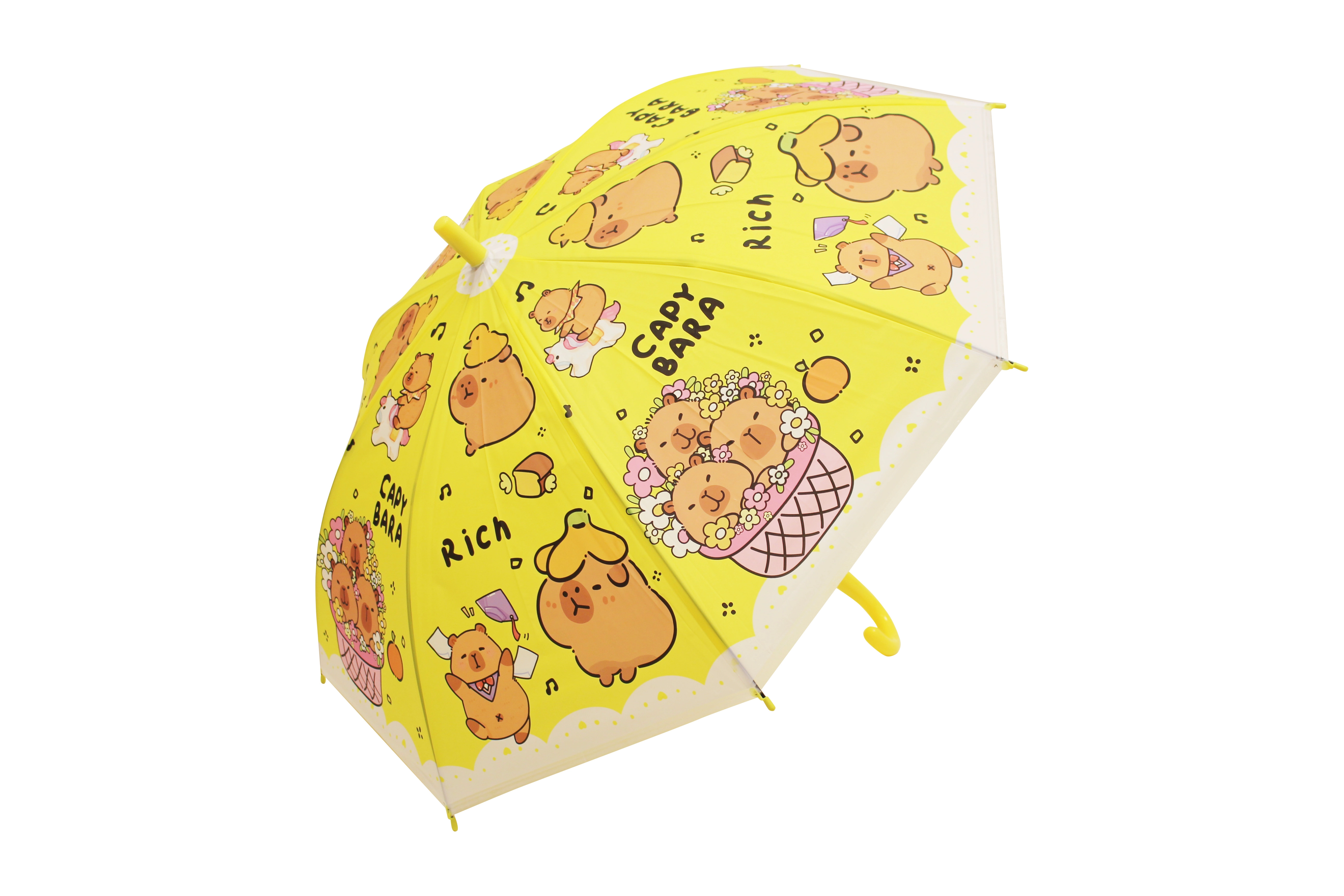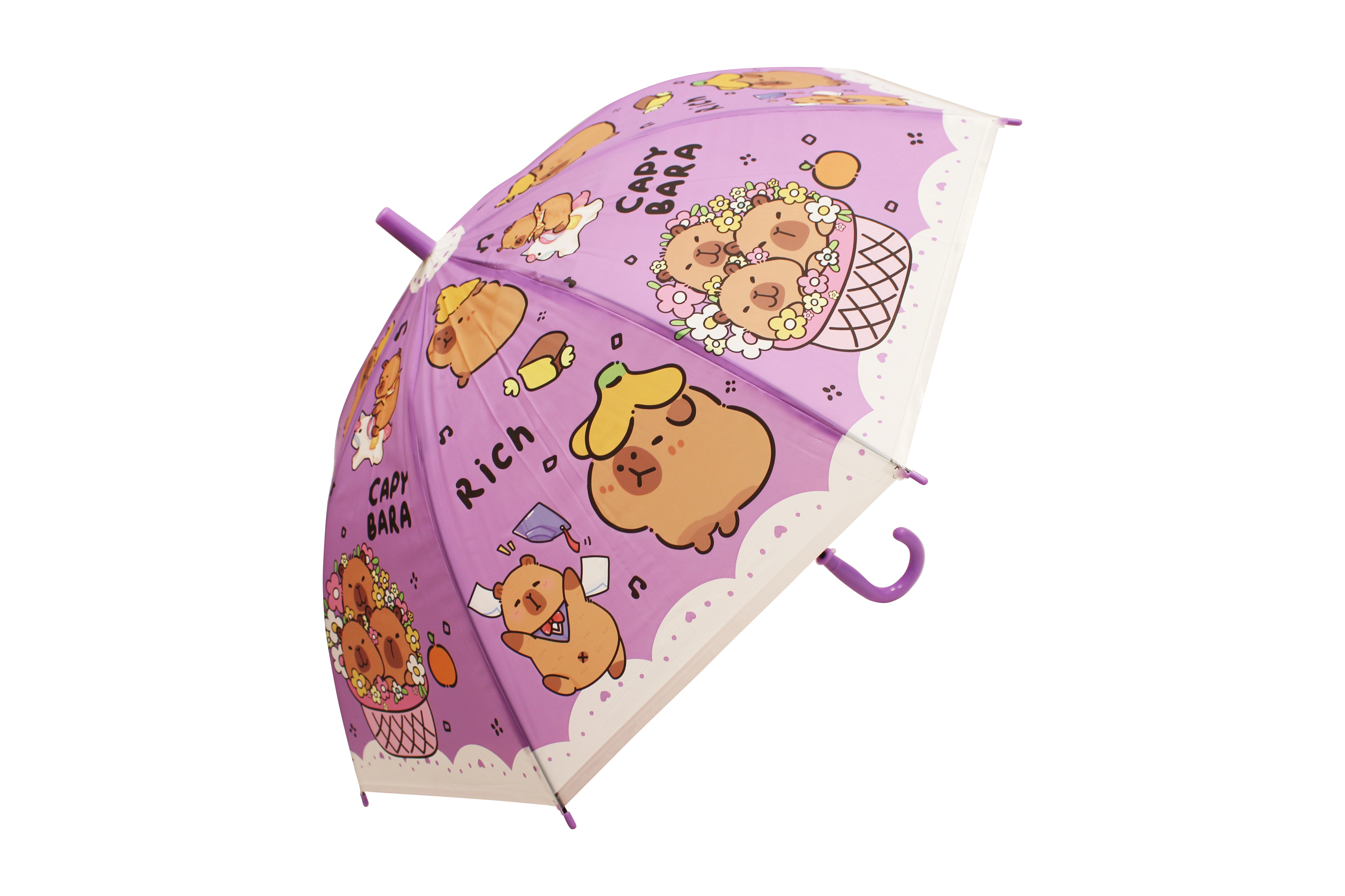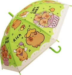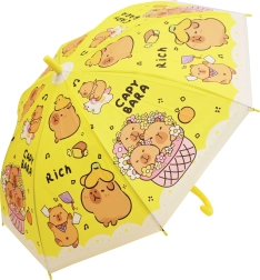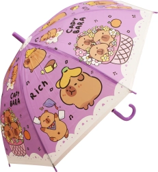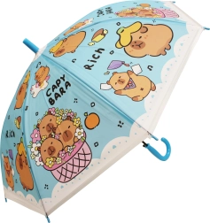O umbrelă drăgălașă pentru copii, cu motiv de capibară, protejează de ploaie și luminează fiecare zi. Disponibilă în patru culori – albastru, verde, galben și mov – cu mâner curbat confortabil și construcție ușoară pentru purtare facilă. Ideală pentru copii datorită execuției sigure și designului jucăuș cu capibare.