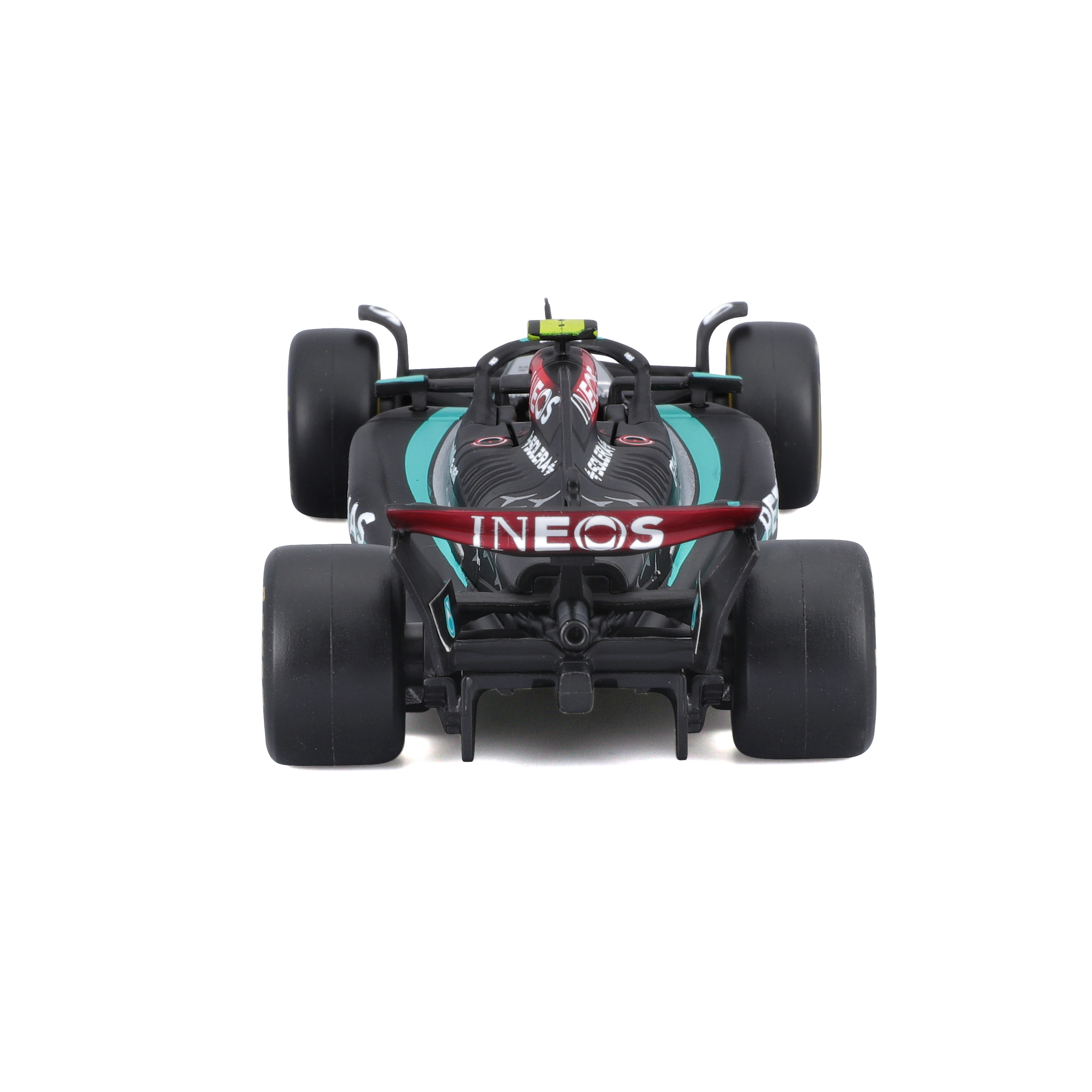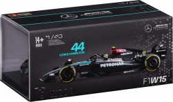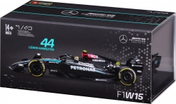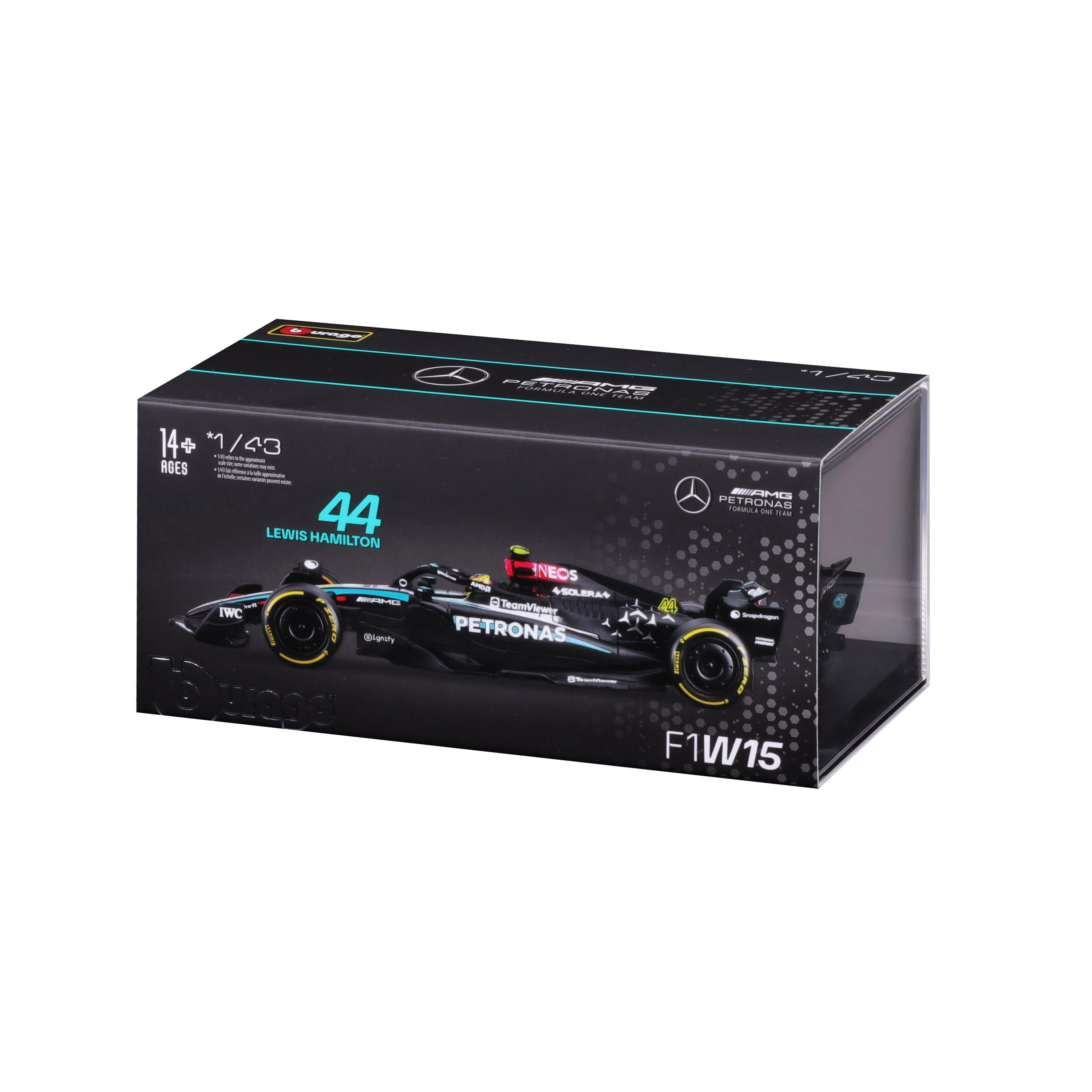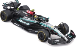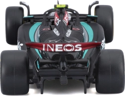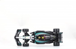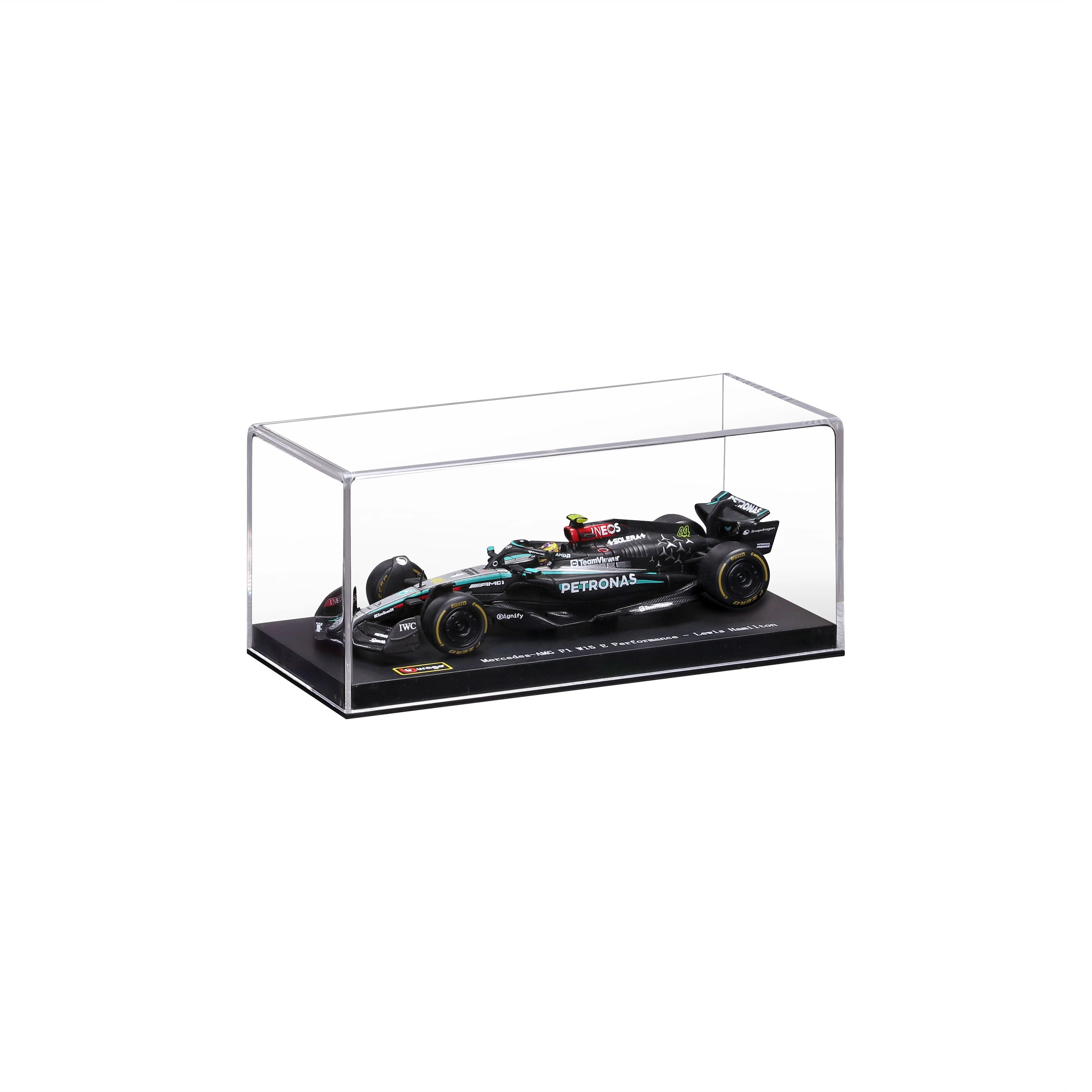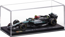 Modelul este livrat într‑o vitrină acrilică cu postament, care protejează împotriva prafului și evidențiază aspectul la expunere. Datorită roților rulante îl puteți aranja ușor în vitrină sau pe birou. Cadou excelent pentru fanii LEWIS HAMILTON și ai erei moderne F1.