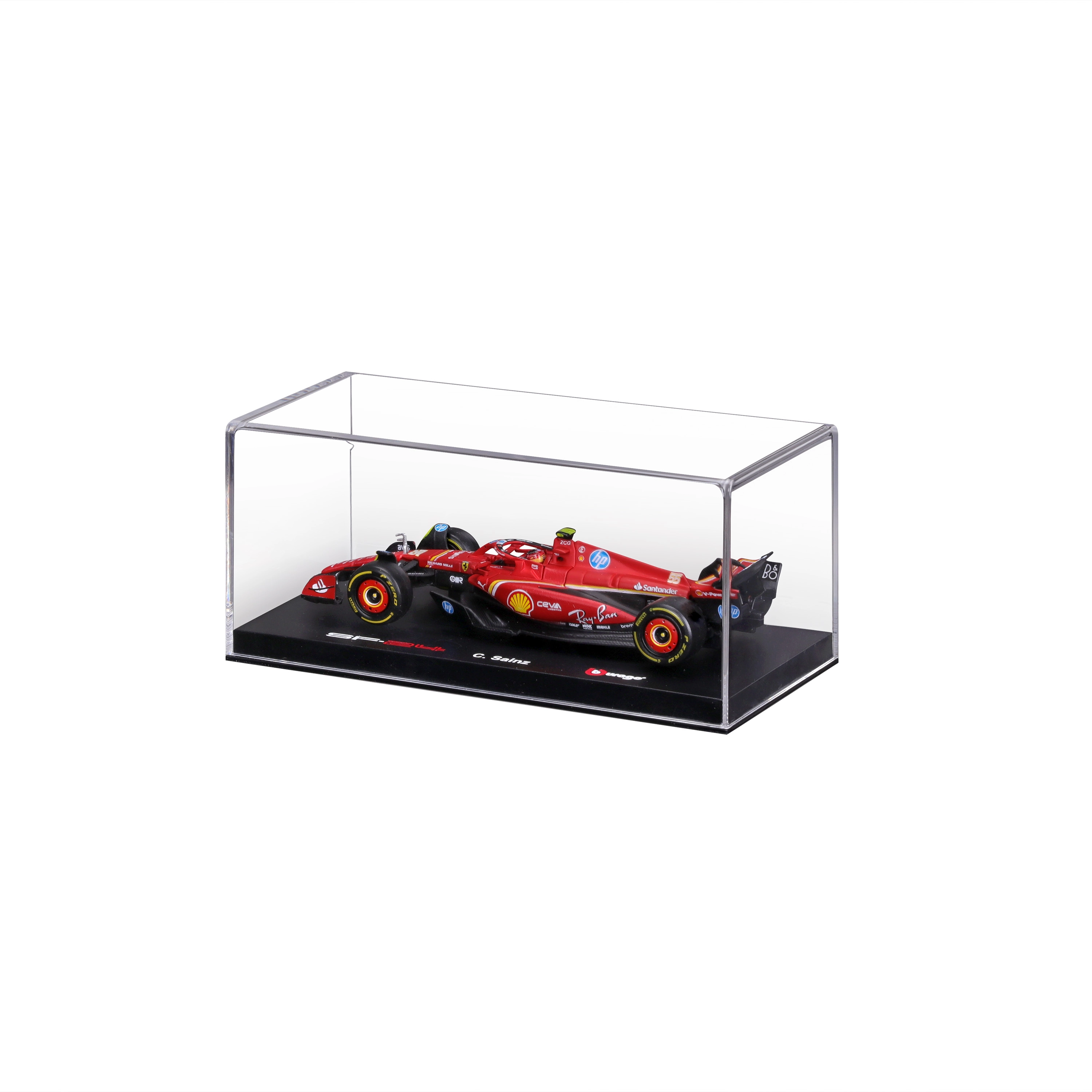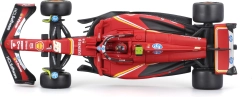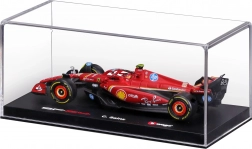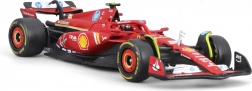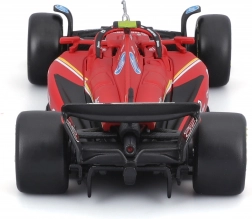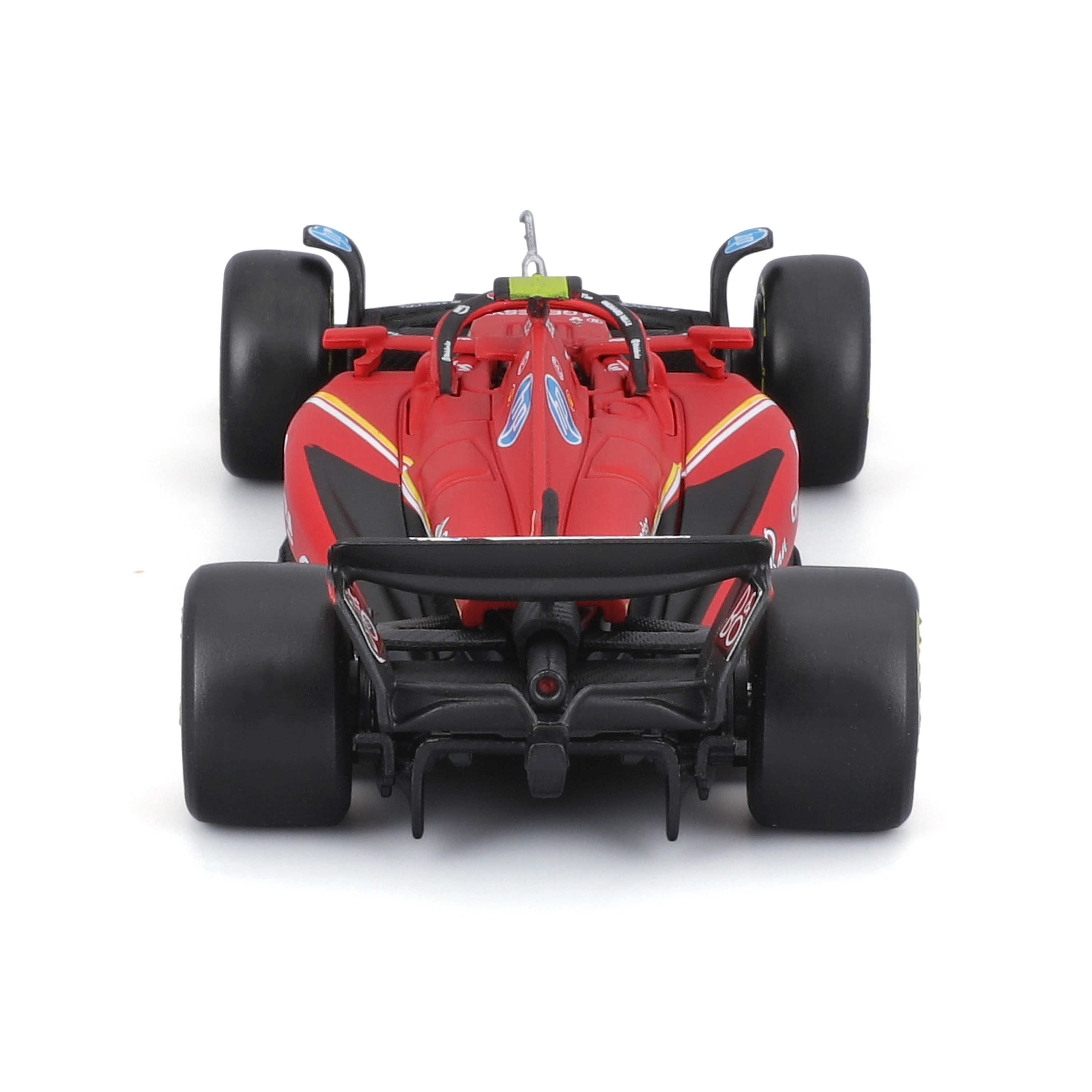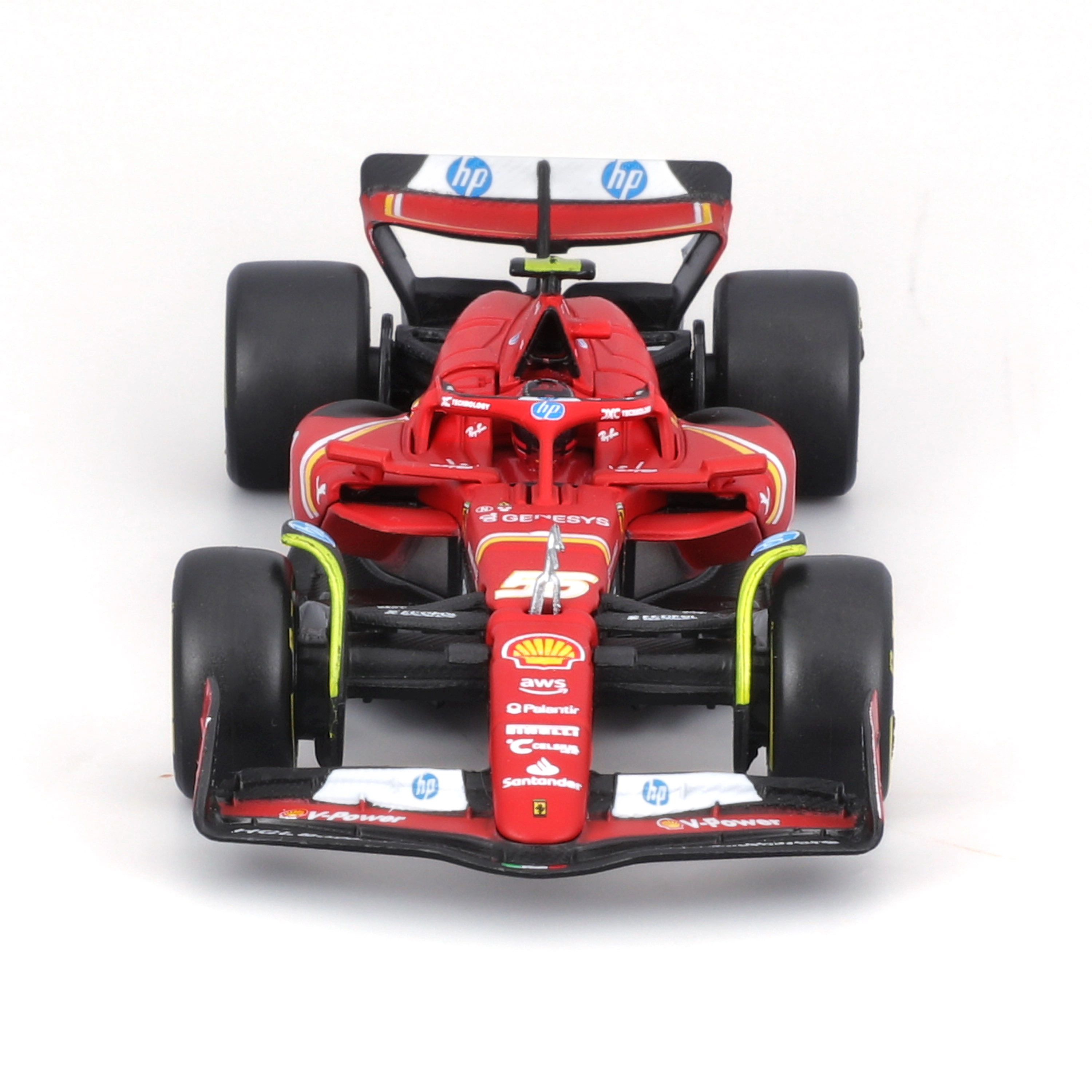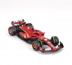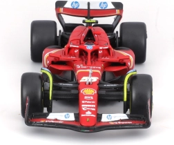 Proporții fidele ale Ferrari SF-24 cu logouri ale sponsorilor, aripi aerodinamice și detalii ale cockpitului cu pilotul Carlos Sainz.