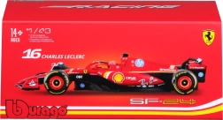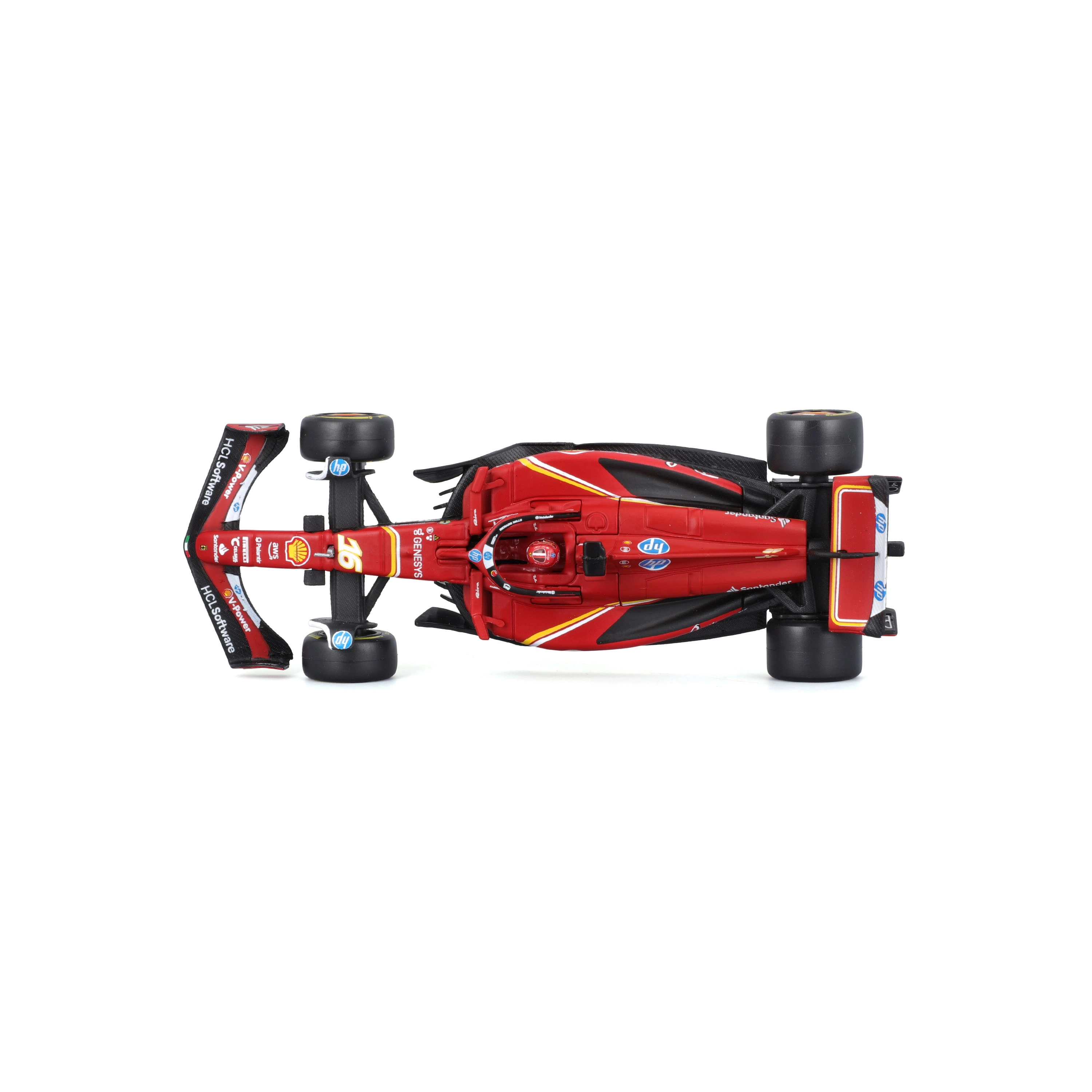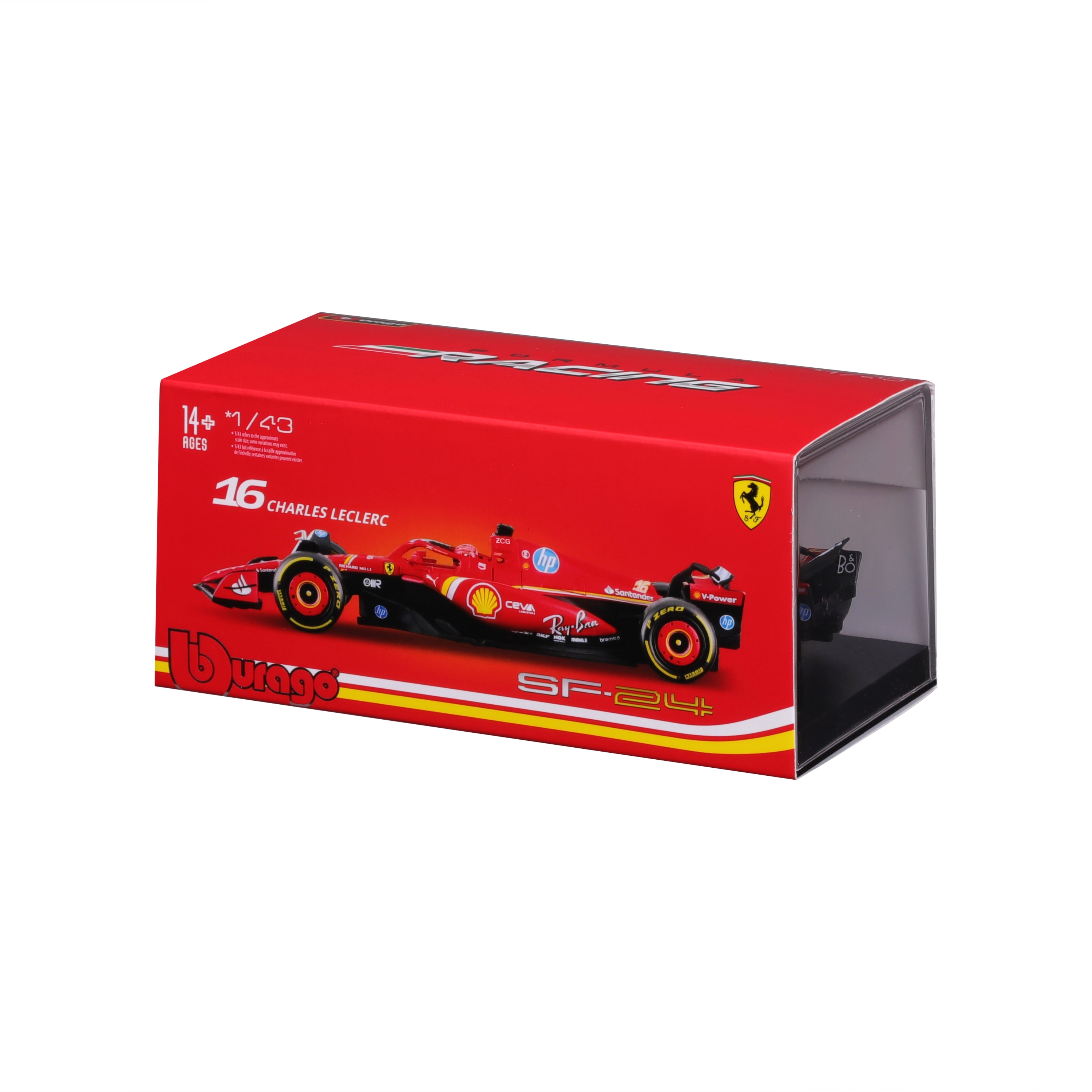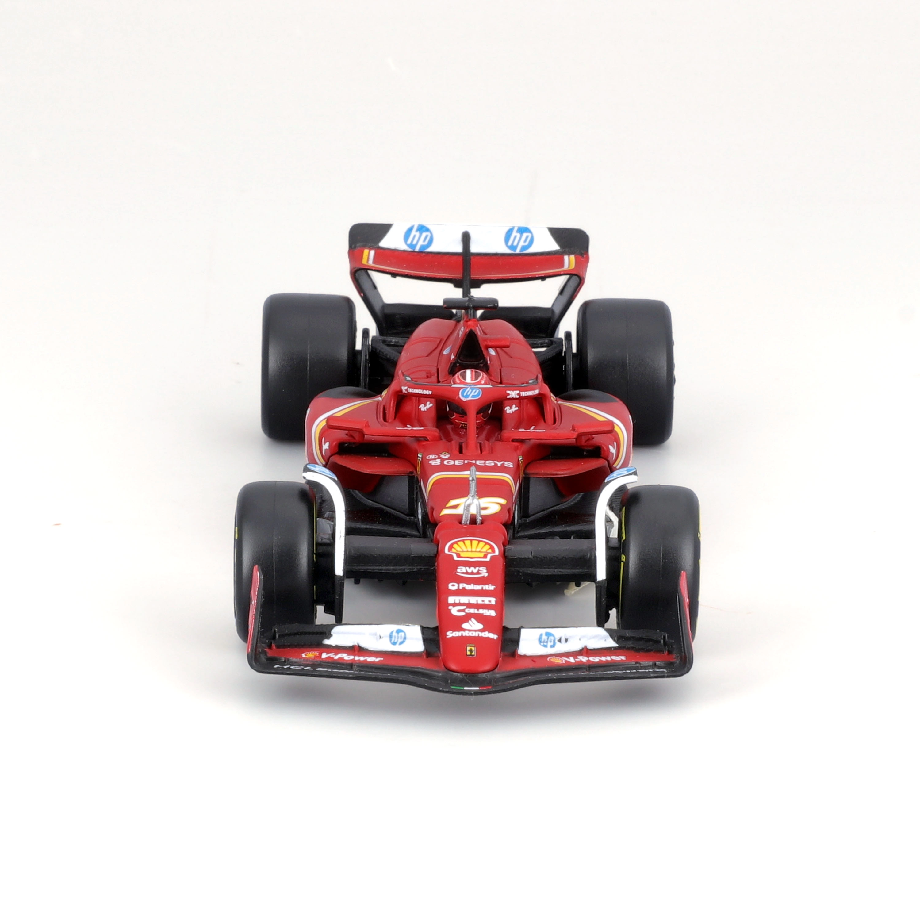 Acest model Ferrari SF-24 (2024) licențiat oficial de Bburago reproduce fidel formele monopostului, inclusiv aripa față și spate, halo și vopseaua de competiție cu logourile sponsorilor. Scara 1:43 este ideală pentru serii de colecție și expunere compactă.