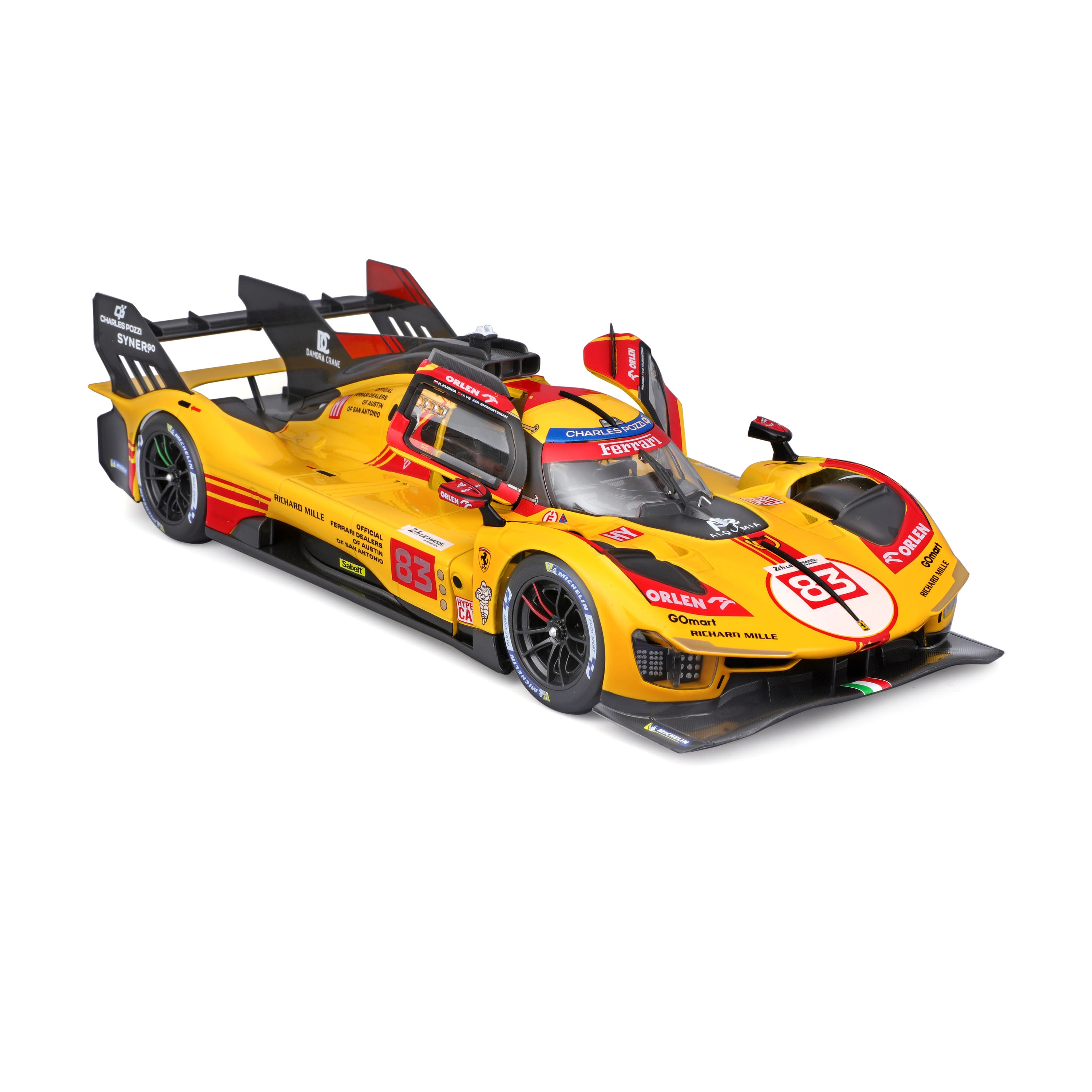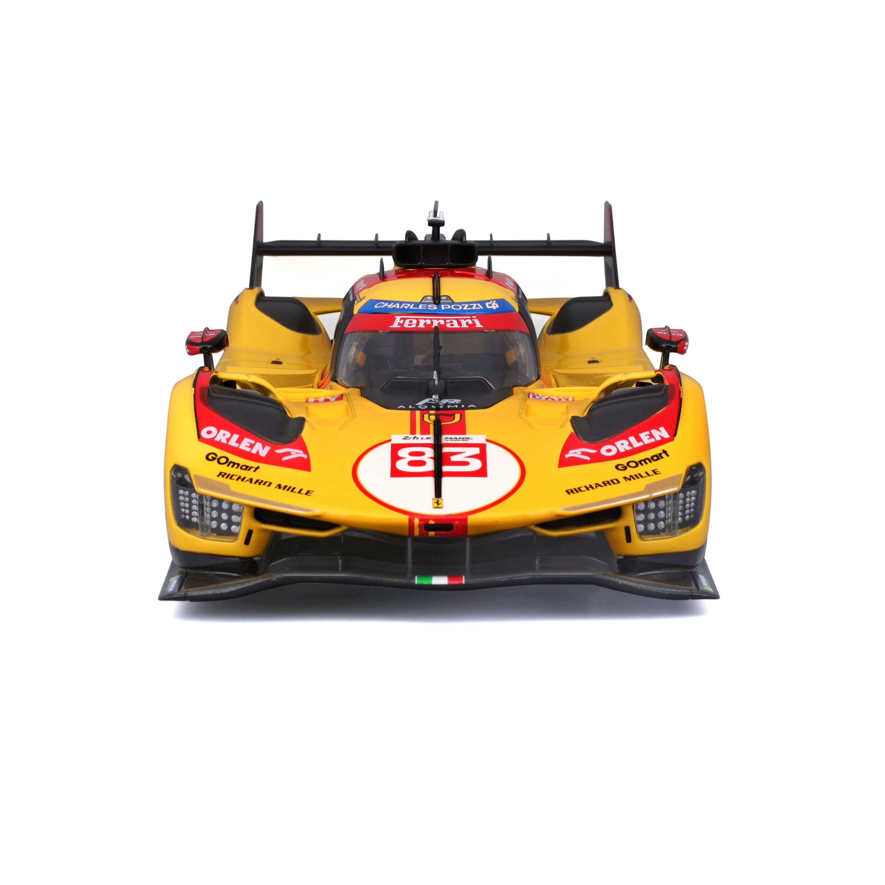 Descoperă modelul realizat la superlativ Ferrari 499P în schema cromatică iconică galben‑roșu, cu numărul de concurs 83, din renumita cursă 24H Le Mans 2024. Construcție metalică cu finisare de precizie, aerodinamică reprodusă fidel și discuri de frână realiste care subliniază aspectul autentic al prototipului de competiție.