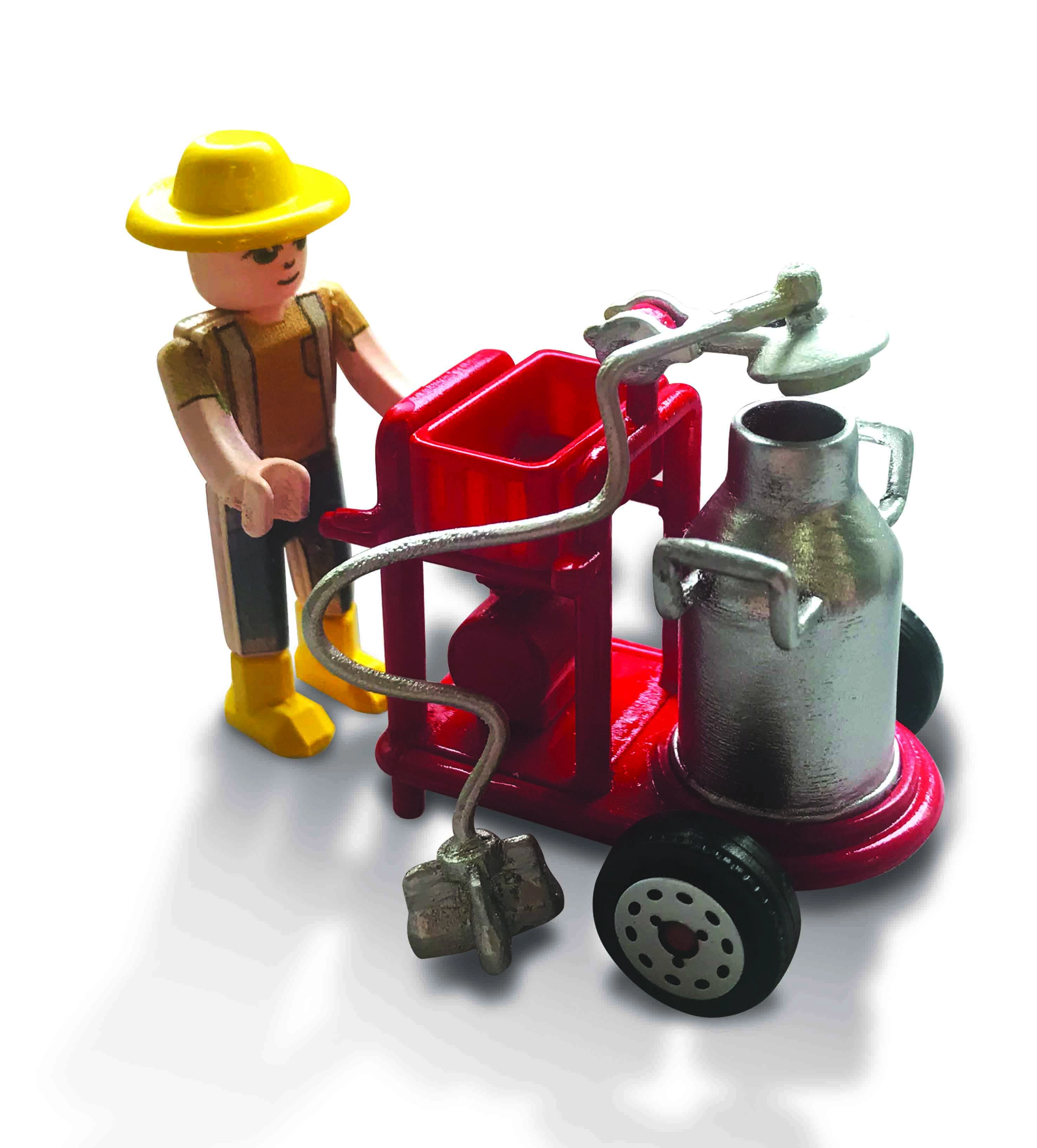 Fermierul cu aparat de muls mobil și furtunuri aduce o rutină de fermă autentică. Căruțul se manevrează ușor și extinde posibilitățile de joacă.