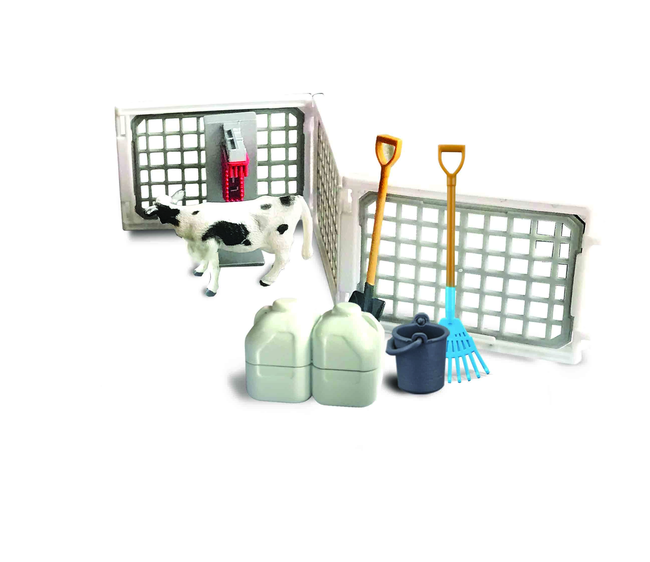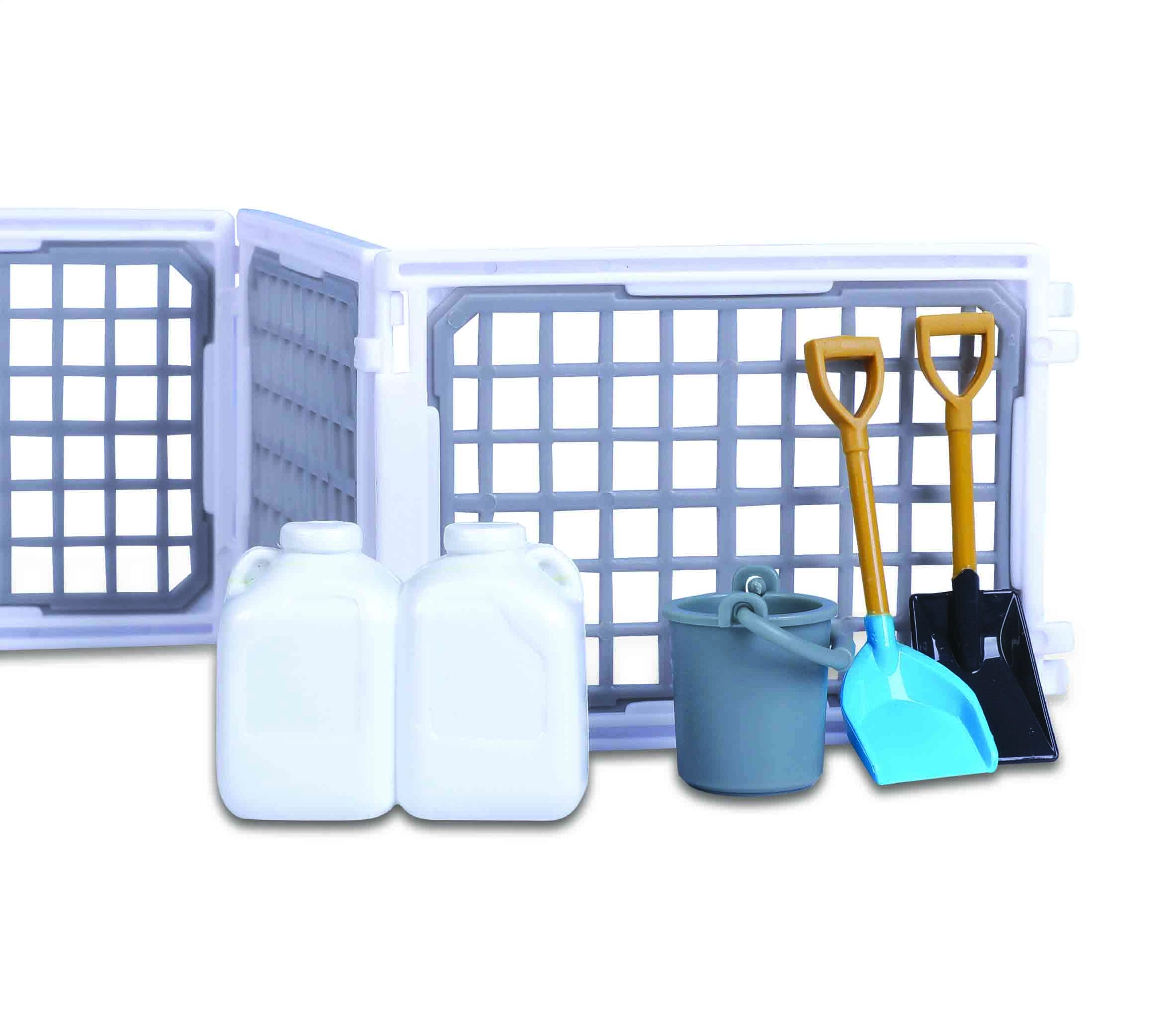 Lopeți, greble, găleți și canistre ajută la întreținerea țarcului. Copiii vor exersa hrănirea, curățenia și îngrijirea vitelor ca pe o fermă adevărată.