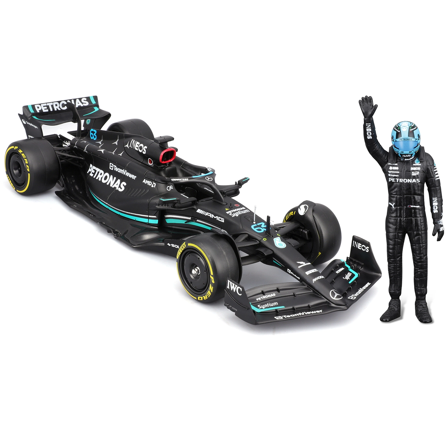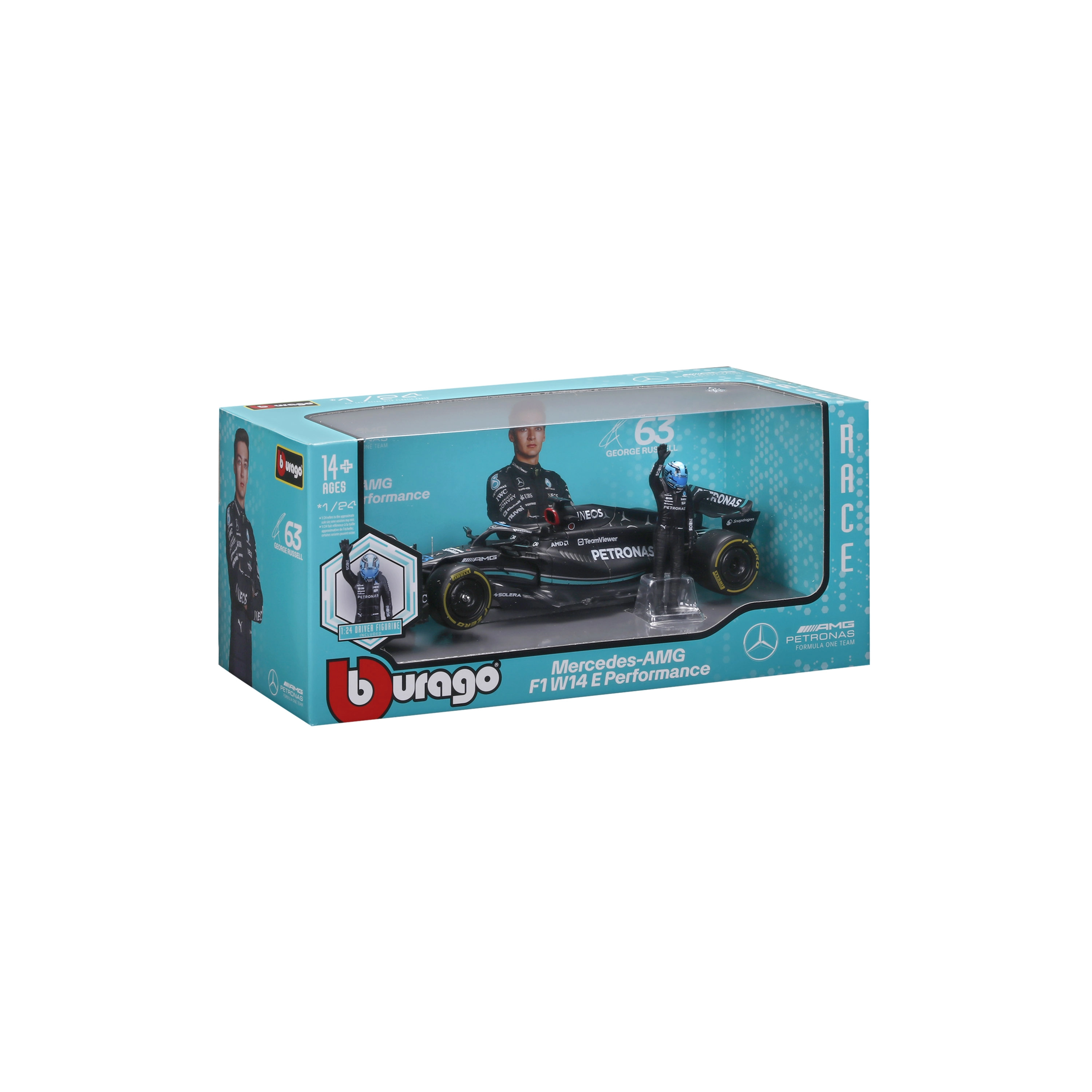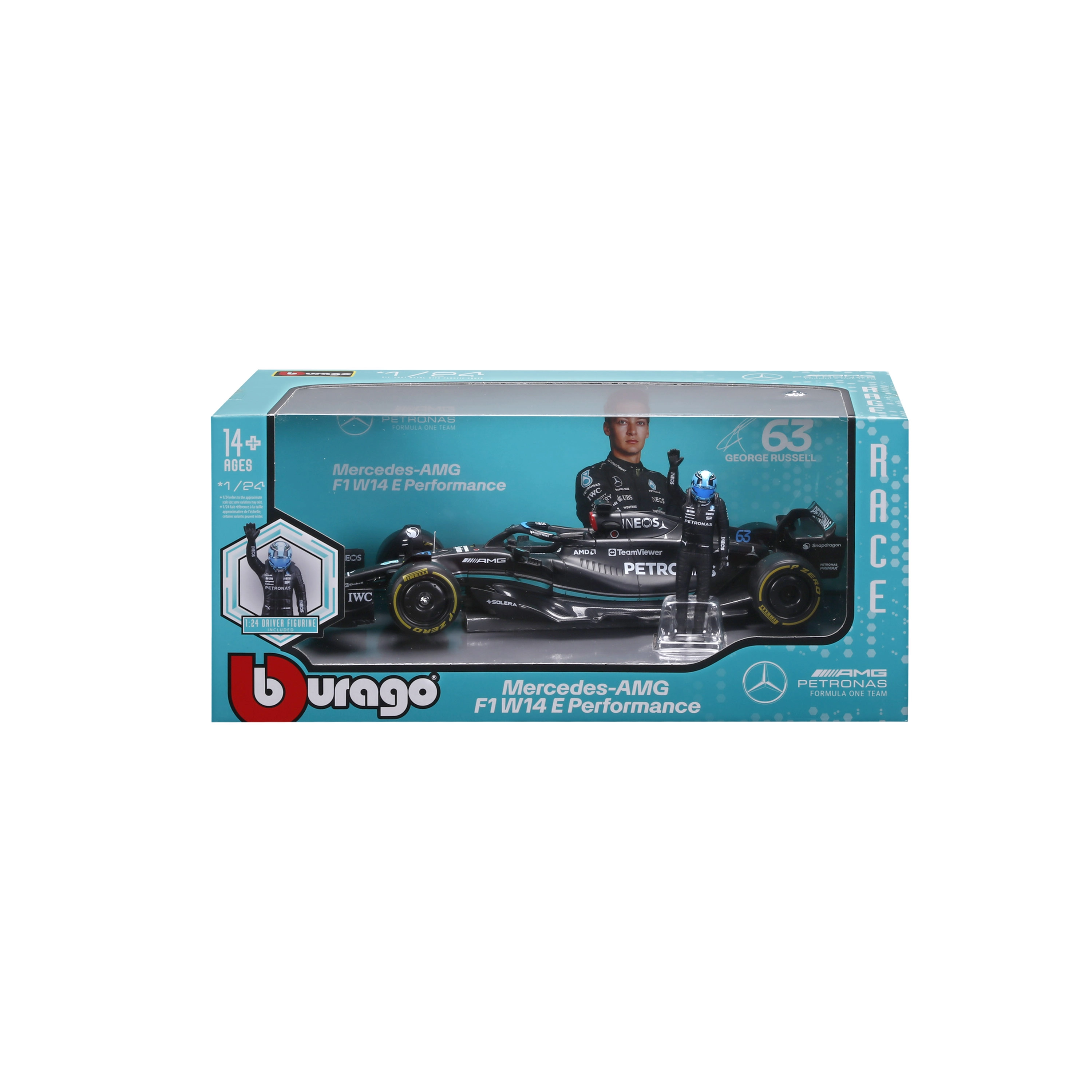 Pachetul include figurină decorativă a pilotului George Russell și inscripționări de calitate ale livery‑ului cu sponsori, care subliniază fidelitatea față de original. Modelul este ideal pentru display, vitrină și ca cadou pentru fanii F1.