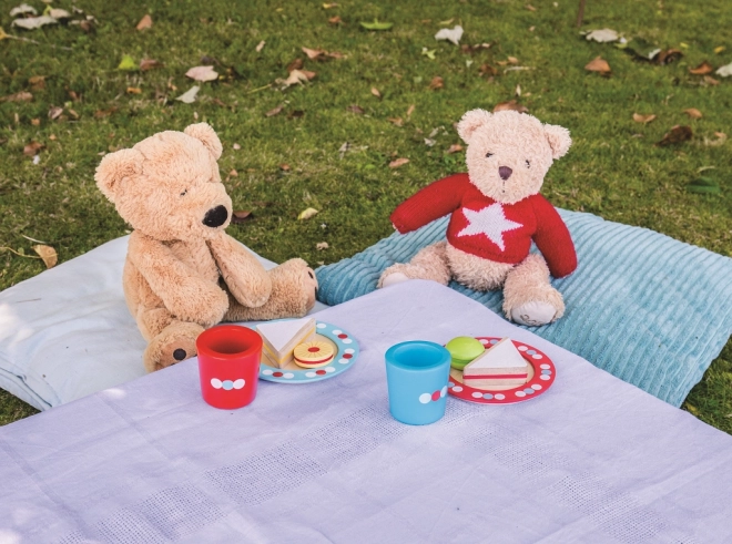 Acest set de ceai din lemn cu buline, plin de farmec, invită la un „ceai la ora cinci”. Copiii exersează servirea, politețea și împărtășirea, antrenând totodată prinderea și coordonarea mâinilor. Detaliile colorate și dimensiunile bine gândite îl transformă într-un accesoriu îndrăgit pentru orice bucătărie de jucărie.