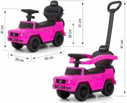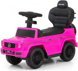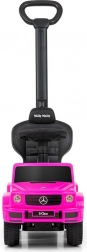 Mașinuța de împins licențiată MERCEDES G350d în culoare roz arată ca un adevărat vehicul off-road și îi motivează pe copii la mișcare activă, antrenând echilibrul și motricitatea. Datorită spătarului înalt, cotierelor laterale și tijei de ghidare, este potrivită pentru copiii care pot sta în șezut, dar și pentru micii mergători. După îndepărtarea tijei de ghidare, a cotierelor și a scărilor de sprijin se transformă într-o mașinuță clasică de împins.