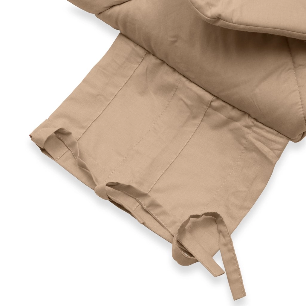 Husa din 100% bumbac este delicată cu pielea sensibilă și nu irită, în timp ce umplutura antialergică moale menține căldura plăcută și împiedică înmulțirea microorganismelor. Culoarea neutră cappuccino se potrivește perfect în cărucior și pătuț și are un efect liniștitor.