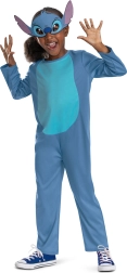 Combinezonul albastru cu panou abdominal deschis la culoare și masca specifică redau fidel personajul îndrăgit din Lilo & Stitch.