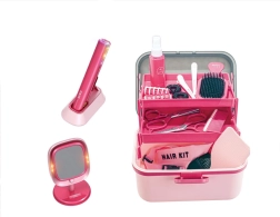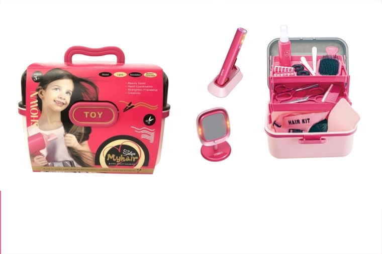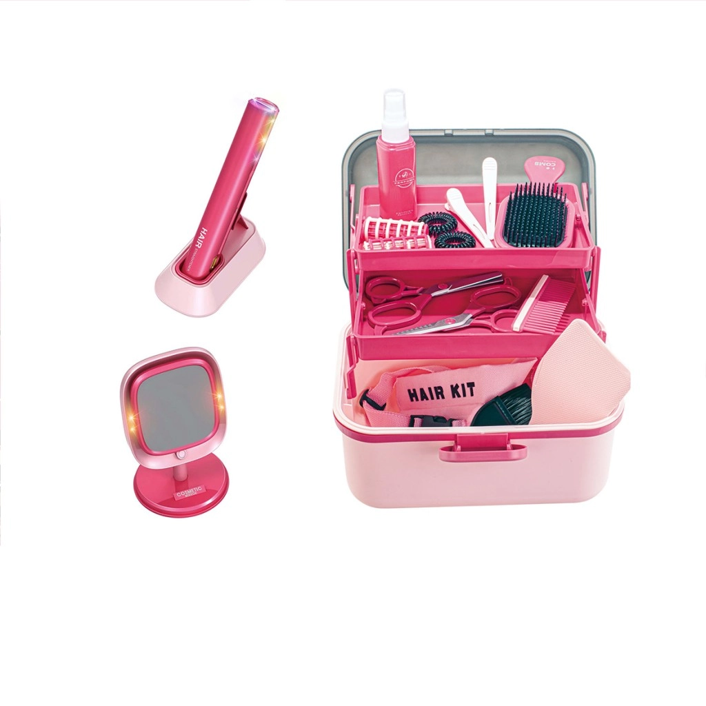 - Placă de păr pentru copii, suport de încărcare, oglindă de masă cu efecte luminoase, valiză cu compartimente, pieptene, perii, foarfecă, agrafe, spray (jucărie)