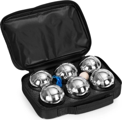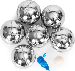Setul conține 6 mingi rezistente din oțel cromat cu diametrul de 72 mm și greutatea de cca 700 g pentru o aruncare confortabilă și stabilă. Două modele diferite de striații facilitează deosebirea mingilor în timpul jocului. Cochonnetul din lemn servește drept țintă, iar șnurul de măsurare ajută la soluționarea corectă a situațiilor disputate.