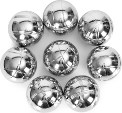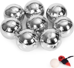 Setul include 8 bile din oțel cromat cu modele liniare diferite pentru a distinge ușor jucătorii. Fiecare bilă are diametrul de 72 mm și o greutate de aproximativ 700 g pentru o prindere sigură și o aruncare stabilă. Sunt incluse jack-ul din lemn și sfoara de măsurare pentru a determina cu precizie care bilă este mai aproape – joc corect fără controverse.
