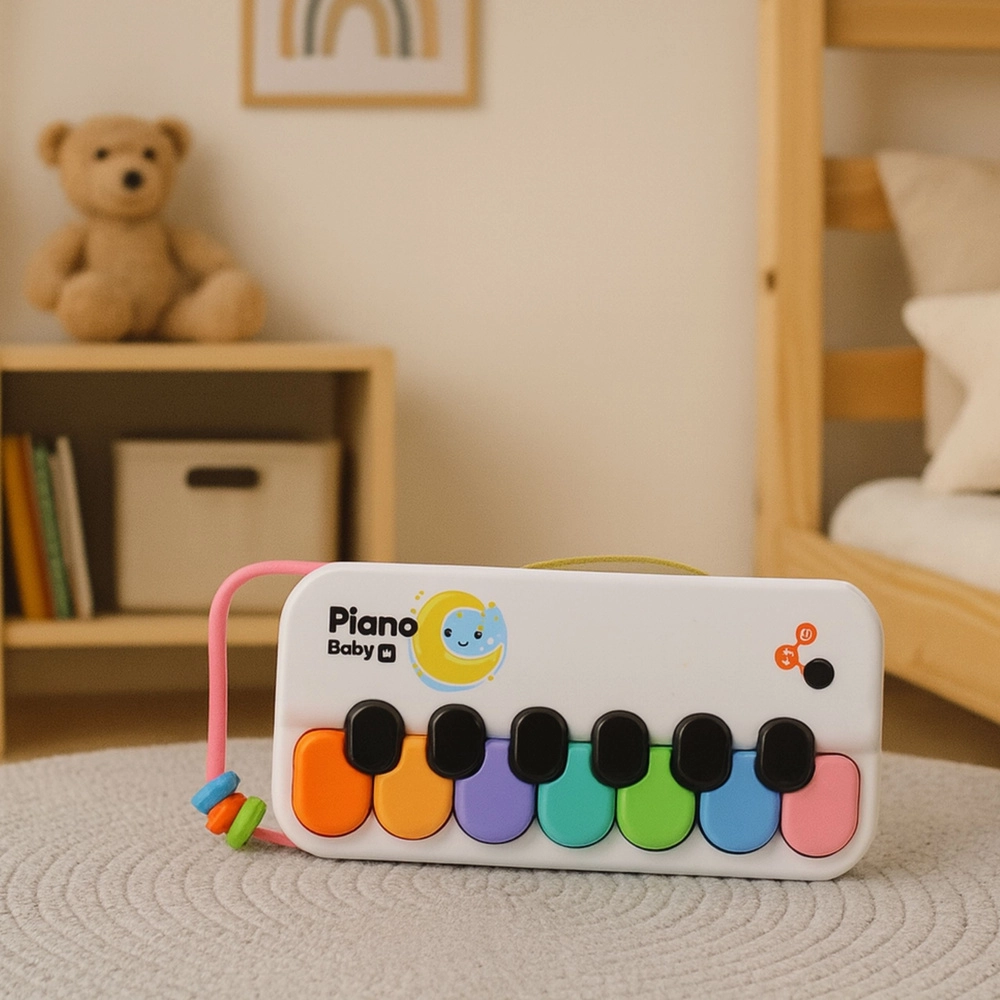 Pianul interactiv colorat pentru cei mici dezvoltă auzul, ritmul și imaginația. Datorită celor 8 clape viu colorate, efectelor sonore plăcute și designului ușor, portabil cu curea ușor de prins, este ideal acasă, la grădiniță și în călătorii. Fabricat din materiale sigure, perfect pentru mânuțele mici.