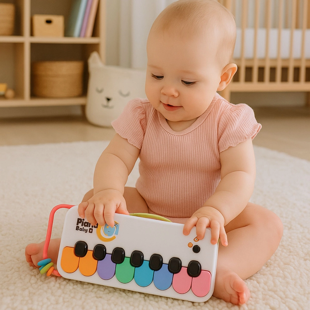 Fiecare apăsare produce un sunet și îi motivează pe copii să descopere melodii, dezvoltând auzul și coordonarea mână–ochi.