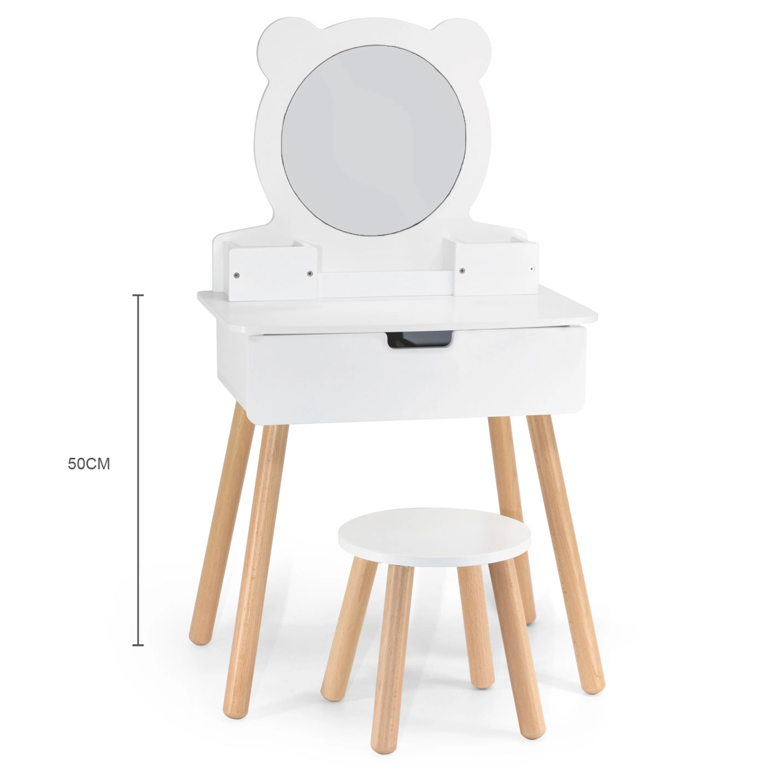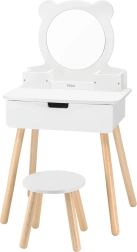 Construcție solidă din lemn, oglindă rotundă cu „urechiușe de ursuleț”, sertar practic și compartimente care păstrează toate accesoriile la locul lor.