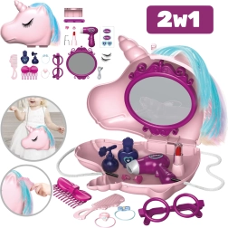 Setul conține și o geantă cu unicorn cu dotări bogate pentru jocul de coafor și salon de cosmetică. Copiii pot încerca machiajul, pieptănatul și uscarea – uscătorul-jucărie suflă aer – și pot coafa „coama” unicornului. Acest joc susține creativitatea, motricitatea fină, imaginația și abilitățile de coordonare.